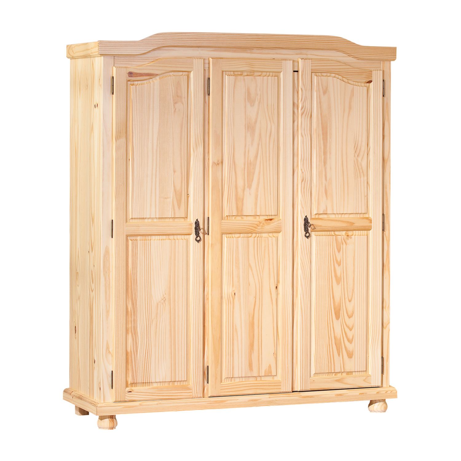 BERN šatníková skriňa v prevedení masív borovica lak má priestor delený v pomere 2:1. Širšia časť skrine obsahuje šatníkovú tyč a policu, užšia časť potom tri variabilné police. Všetko vaše oblečenie teda umiestnite do tejto priestrannej skrine. Zvršky zavesíte na pevnú tyč a ostatné veci a doplnky odložíte na variabilné police. Veľká skriňa má zaujímavý dizajn a dvere uzamykateľné za pomoci kovových kľúčikov. Masívny nábytok je kvalitný a izba zariadená svetlým nábytkom bude vždy pôsobiť príjemne. Trojdverová šatníková skriňa si nájde uplatnenie nielen vo vašej domácnosti, ale bude sa aj hodiť na vašu chalupu alebo chatu. Obrovská masívna skriňa bude skvelou voľbou do študentskej izby či spálne vybavenej masívnym nábytkom.