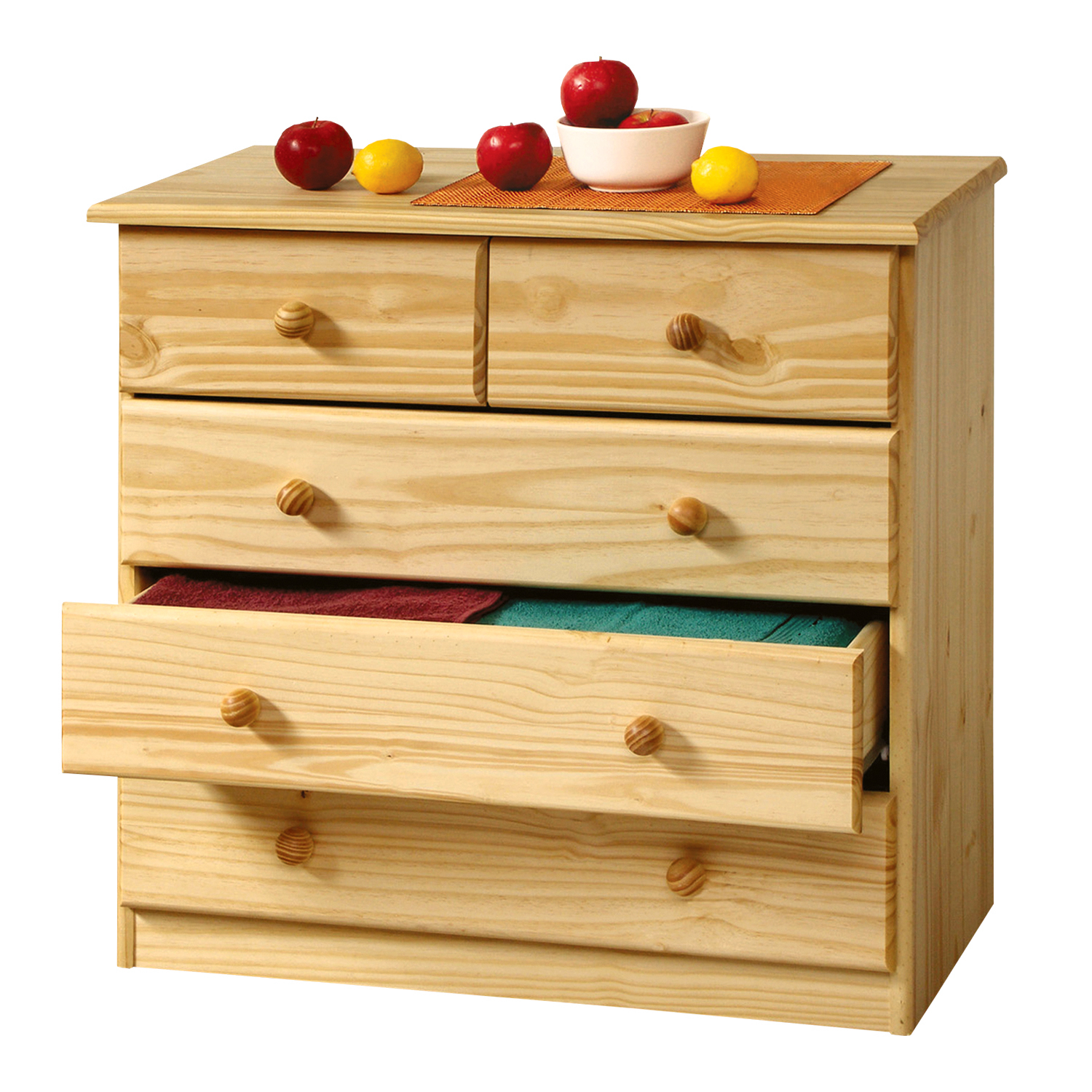 Bielizník 918 lakovaný v prevedení masív borovica lak má 2 úzke a 3 široké zásuvky s kovovými pojazdmi, hĺbka zásuvky je 32,5 cm. Bielizník nechá priestor na obrázky na stenách i dekorácie postavené na jeho ploche. Ak nechcete zaplniť celý priestor vysokými skriňami, odporúčame vám tento bielizník.