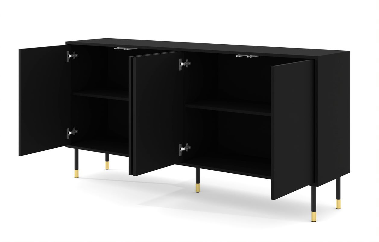 Komoda z kolekcie WOODY je kvintesenciou elegancie a funkčnosti, ktorá sa stane neodmysliteľným prvkom každého moderného interiéru. Jej štvordverová konštrukcia ponúka dostatok úložného priestoru pri zachovaní prehľadného a estetického dizajnu miestnosti. Dômyselne vyfrézované čelá v geometrickom trojuholníkovom vzore dodávajú komode jedinečný charakter a vytvárajú výrazný akcent v dizajne interiéru. Harmonicky ladia s pevnou konštrukciou nábytku, čím zaručujú nielen štýl, ale aj odolnosť. Kovové nožičky v módnej kombinácii čiernej a zlatej farby dodávajú komode elegantný vzhľad a stabilitu. Vďaka systému PUSH TO OPEN je používanie komody pohodlné a intuitívne, čo podčiarkuje jej moderný charakter. Komoda WOODY je nielen praktickým riešením úložného priestoru, ale aj jedinečným dekoratívnym prvkom, ktorý do interiéru vnesie eleganciu a štýl. Vďaka zmyslu pre detail a funkčnosti sa stane srdcom každej obývačky, spálne alebo kancelárie.