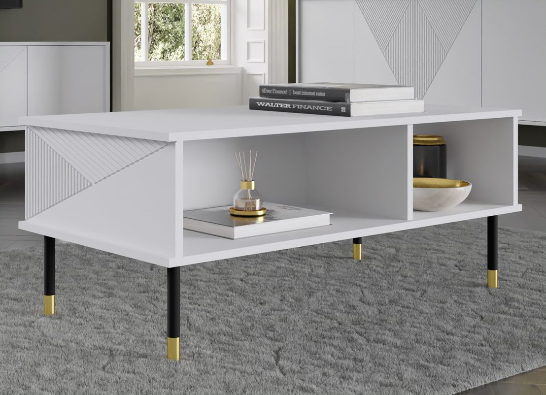 Konferenčný stolík z kolekcie WOODY je jedinečný kúsok, ktorý sa hodí do moderných interiérov a dodáva im eleganciu a funkčnosť. Jeho obdĺžniková vrchná doska poskytuje dostatok priestoru na umiestnenie dekorácií a nápojov alebo občerstvenia pri stretnutí s priateľmi alebo relaxácii s rodinou. Sofistikované detaily, ako napríklad vyfrézované predné plochy v geometrickom trojuholníkovom vzore, mu dodávajú jemný, ale osobitý charakter. Tieto prvky harmonizujú s minimalistickým dizajnom a zaručujú pevnosť a odolnosť nábytku. Ďalšou výhodou sú kovové nožičky, ktoré nielen dotvárajú jeho moderný vzhľad, ale zabezpečujú aj stabilitu a odolnosť. Praktickým riešením sú poličky umiestnené pod vrchnou doskou, ktoré ponúkajú ďalší úložný priestor, vďaka čomu je konferenčný stolík WOODY nielen estetickým, ale aj funkčným kusom nábytku na každodenné použitie.