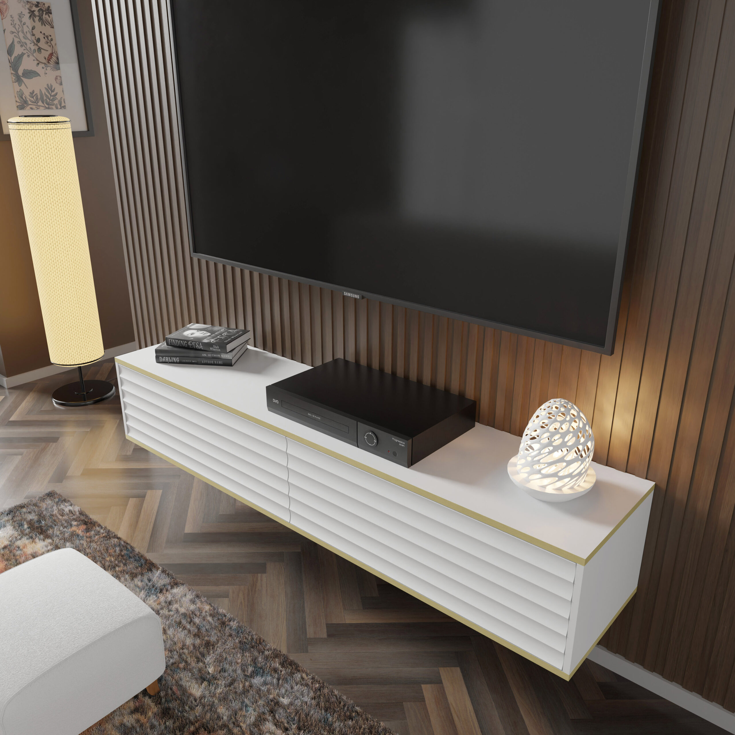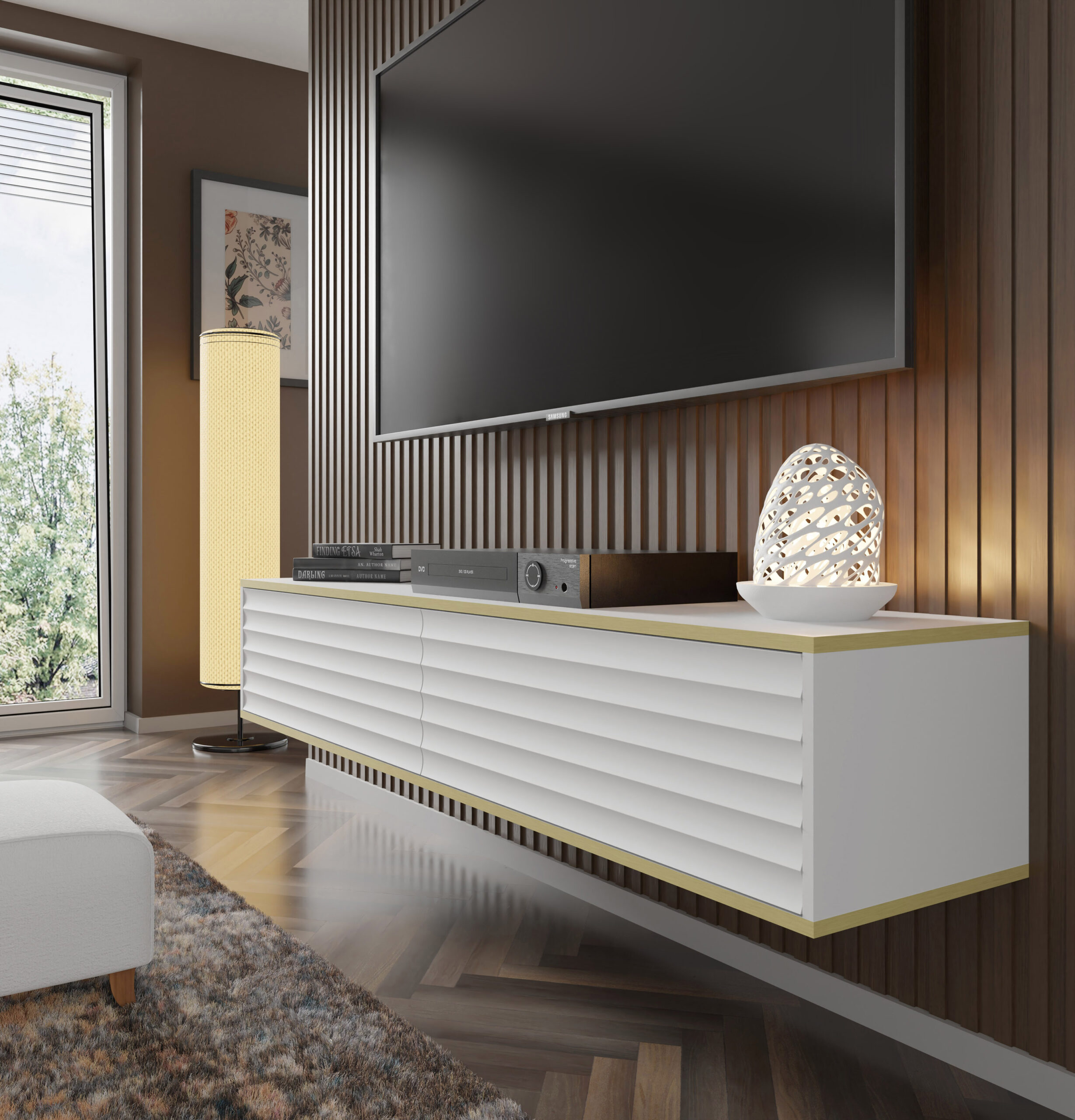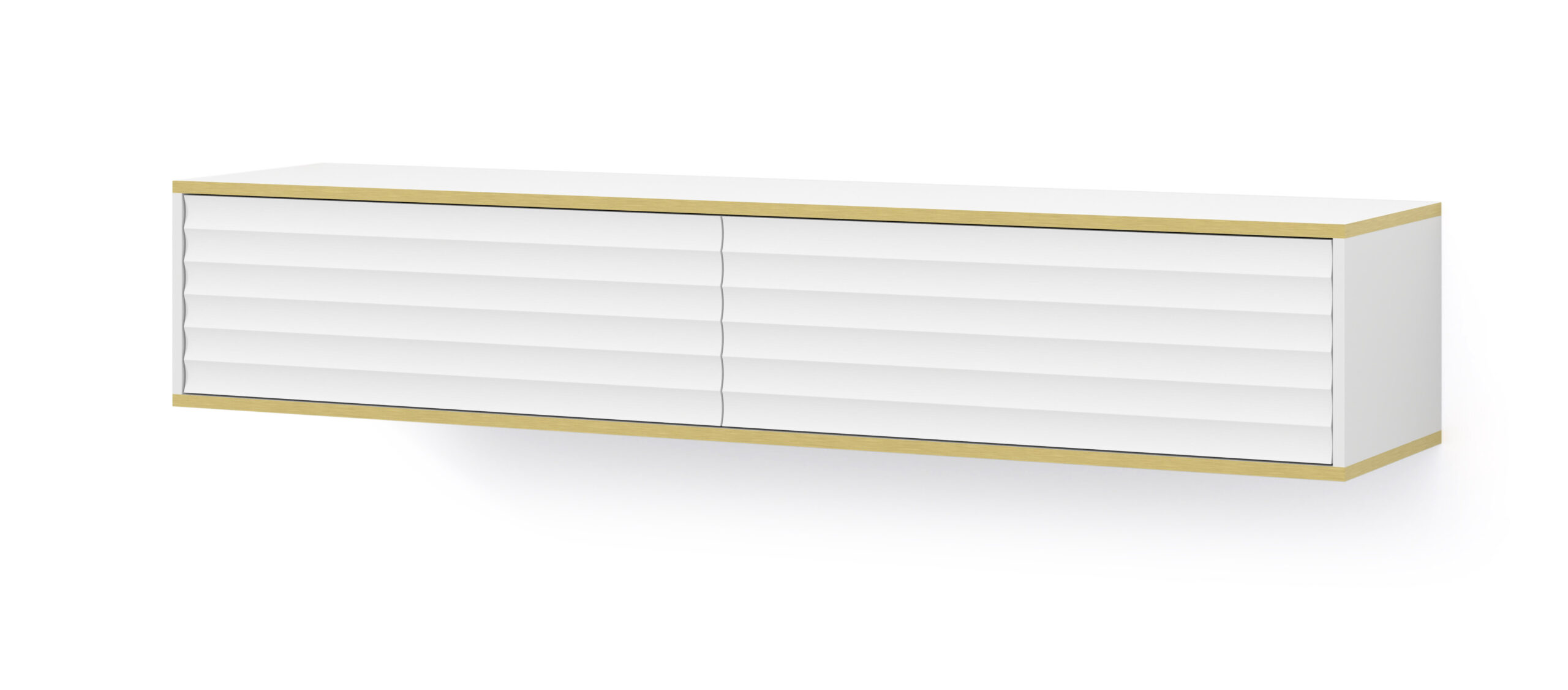 Zlaté akcenty v podobe jemných horizontálnych línií dodávajú skrini harmonický výraz a vytvárajú ucelenú kompozíciu s klasickou farebnou schémou. Vďaka možnosti zavesenia na stenu pôsobí tento kus nábytku ľahko a moderne a zároveň optimalizuje priestor. Vďaka inovatívnemu systému PUSH TO OPEN je používanie skrinky skutočným potešením. Bez použitia úchytiek alebo madiel sa dvierka dajú jednoducho otvárať a zatvárať, čím sa používanie stáva ešte pohodlnejším. Dve odkladacie priehradky poskytujú dostatok priestoru na uloženie rôznych predmetov – od elektronických zariadení až po obľúbené knihy alebo suveníry.