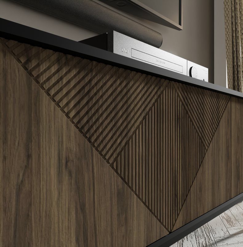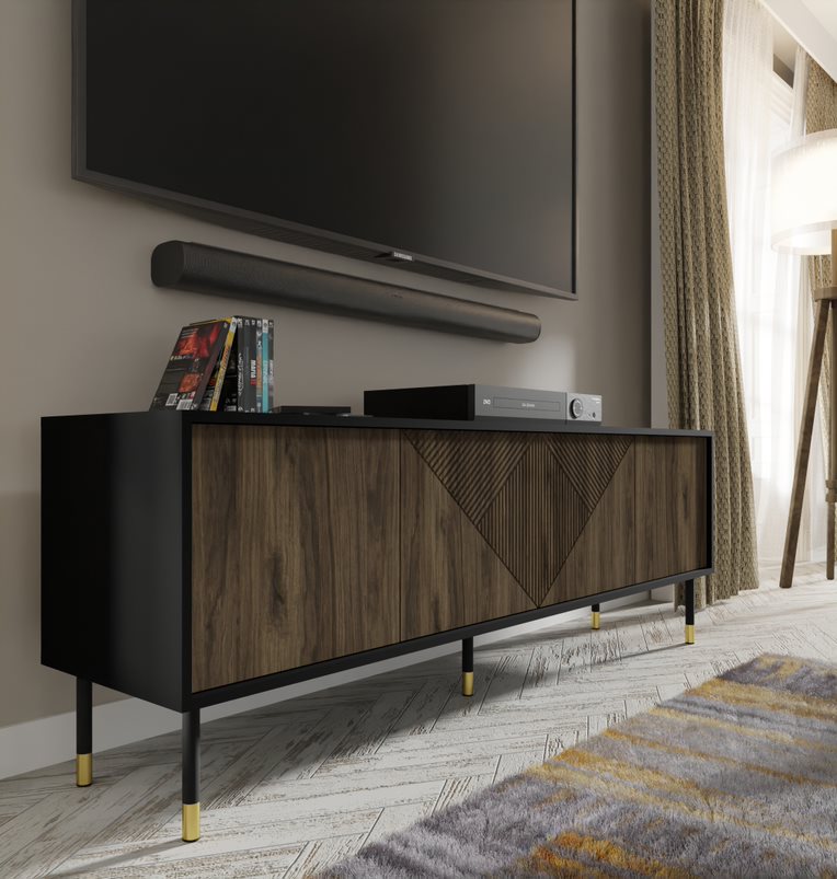 Skriňa RTV z kolekcie WOODY je mimoriadne štýlový a funkčný kúsok, ktorý dodá eleganciu každej obývačke. Jej štvordverová konštrukcia poskytuje dostatok priestoru na uloženie elektronických zariadení a zároveň umožňuje estetické ukrytie káblov a príslušenstva. Výrazné frézované čelá v geometrickom trojuholníkovom vzore dodávajú skrini jedinečný vzhľad a podčiarkujú jej sofistikovaný dizajn. Kovové nohy v čiernej a zlatej farbe dodávajú skrini eleganciu a stabilitu a vytvárajú harmonickú kombináciu s ostatným nábytkom. Inovatívny systém PUSH TO OPEN uľahčuje každodenné používanie, eliminuje potrebu tradičných úchytiek a zachováva minimalistickú estetiku skrinky. Široká horná doska umožňuje pohodlné umiestnenie televízora a iného zariadenia, vďaka čomu je táto skrinka ideálnym riešením pre komplexné vybavenie obývacej izby. Skrinka RTV z kolekcie WOODY je nielen praktickým kusom nábytku na uloženie elektronických zariadení, ale aj jedinečným dekoratívnym prvkom, ktorý obohatí dizajn interiéru svojím elegantným štýlom a funkčnosťou.