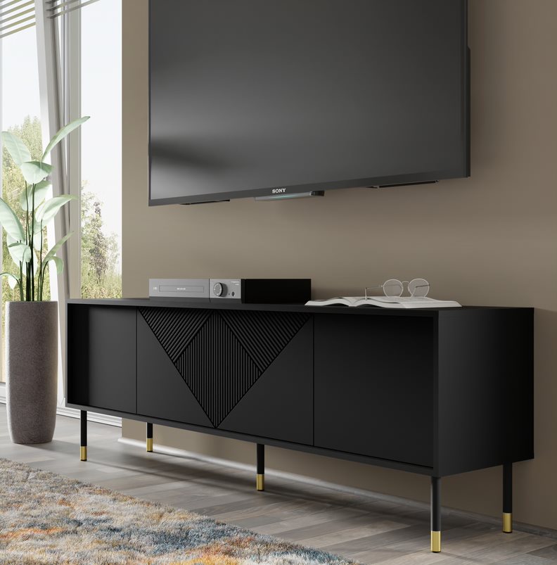 Skriňa RTV z kolekcie WOODY je mimoriadne štýlový a funkčný kúsok, ktorý dodá eleganciu každej obývačke. Jej štvordverová konštrukcia poskytuje dostatok priestoru na uloženie elektronických zariadení a zároveň umožňuje estetické ukrytie káblov a príslušenstva. Výrazné frézované čelá v geometrickom trojuholníkovom vzore dodávajú skrini jedinečný vzhľad a podčiarkujú jej sofistikovaný dizajn. Kovové nohy v čiernej a zlatej farbe dodávajú skrini eleganciu a stabilitu a vytvárajú harmonickú kombináciu s ostatným nábytkom. Inovatívny systém PUSH TO OPEN uľahčuje každodenné používanie, eliminuje potrebu tradičných úchytiek a zachováva minimalistickú estetiku skrinky. Široká horná doska umožňuje pohodlné umiestnenie televízora a iného zariadenia, vďaka čomu je táto skrinka ideálnym riešením pre komplexné vybavenie obývacej izby. Skrinka RTV z kolekcie WOODY je nielen praktickým kusom nábytku na uloženie elektronických zariadení, ale aj jedinečným dekoratívnym prvkom, ktorý obohatí dizajn interiéru svojím elegantným štýlom a funkčnosťou.