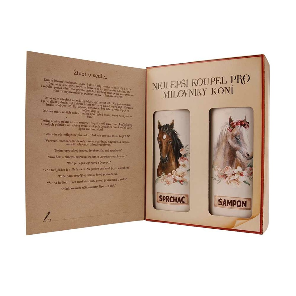 Kozmetický balíček určite poteší všetkých, ktorí majú kone vo svojom srdci. Originálna kozmetická sada obsahuje sprchový gél a vlasový šampón. Netradičný kozmetický darček pre každého milovníka koní. Po odklopení prednej strany krabičky si môžete prečítať krátke texty o koňoch.Krémový sprchový gél s olivovým olejom a podmanivou vôňou 250 ml. Krémový sprchový gél s olejom z plodov olivovníka európskeho. Jemný prostriedok osobnej hygieny vhodný na umývanie celého tela. Obsahuje kvalitný ošetrujúci kozmetický olivový olej so zjemňujúcimi a lubrikačnými účinkami. Zároveň podporuje umývacie schopnosti prípravku a napomáha ochrane pred nadmerným vysušovaním pokožky a jej udržovaniu v hebkom a jemnom stave.Jemný vlasový šampón 250 ml Veľmi jemný prípravok na každodenné umývanie vlasov. Vďaka svojmu zloženiu pomáha chrániť vlasy aj pokožku pred nadmerným vysušovaním pri umývaní, ktoré je šetrné a pritom účinné. Má podmanivú a modernú vôňu, ktorá osviežuje a zanecháva príjemný pocit.