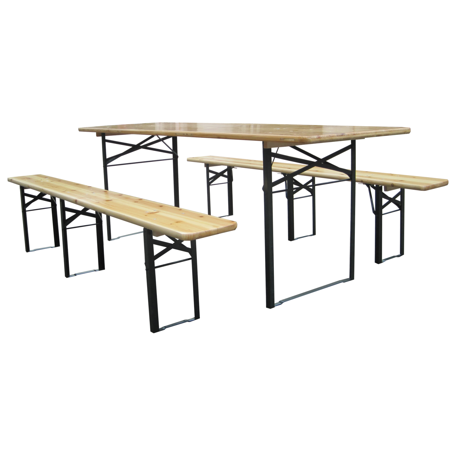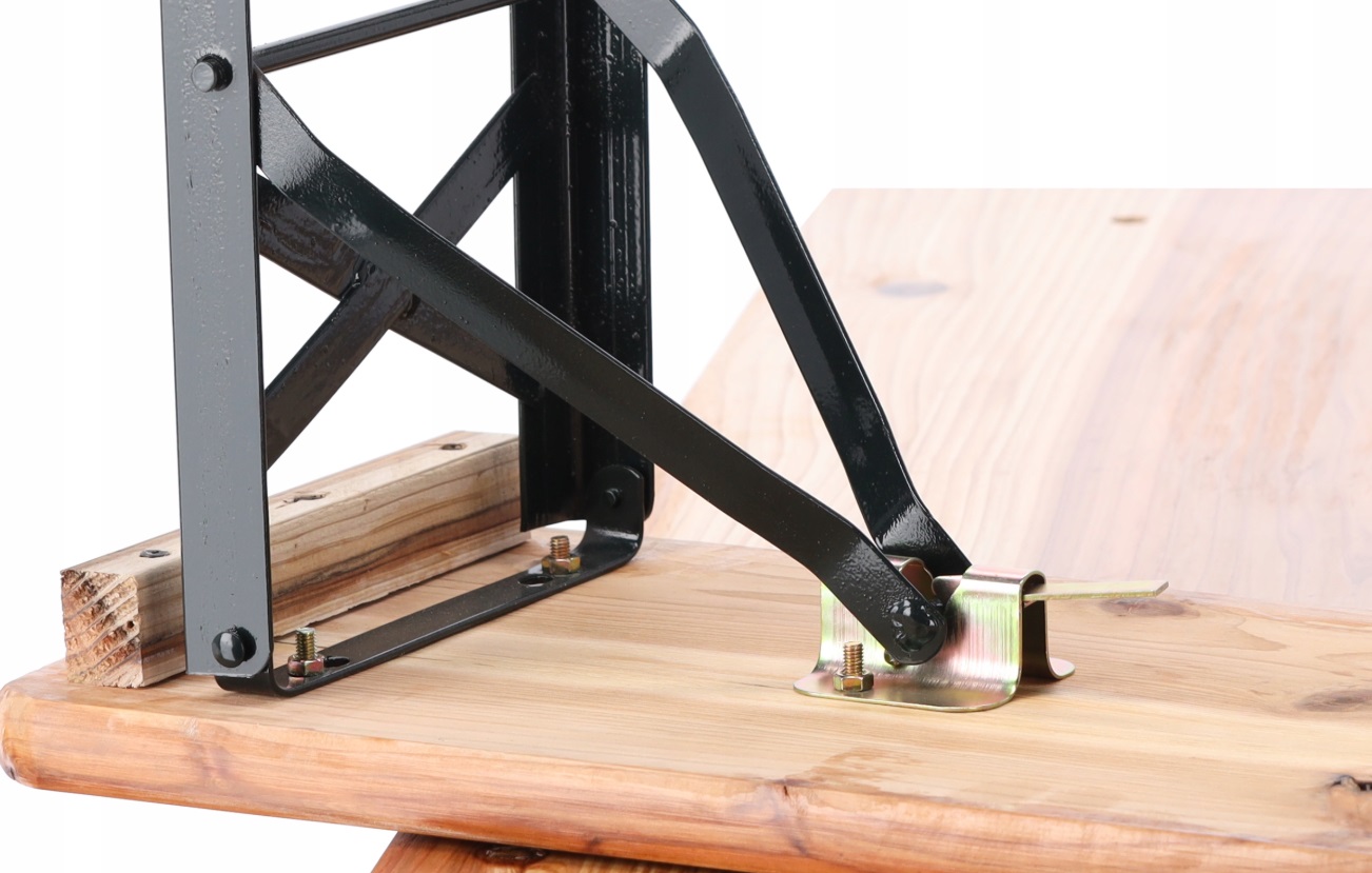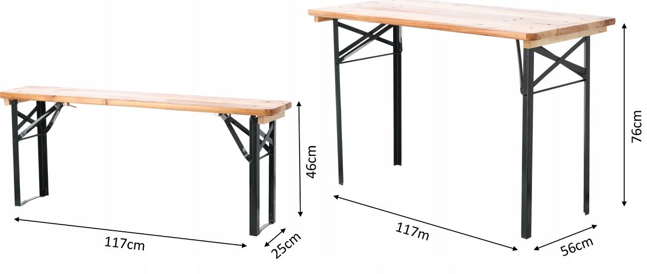 Pivný skladací set CAMP | 117 cm je vyrobený z tlakovo impregnovaného borovicového dreva s povrchovou úpravou laku. Rámové prvky sú z ocele upravenej práškovým nástrekom. Lavičky sú doplnené o tretiu nohu, čo výrazne zvyšuje ich stabilitu a odolnosť. Stôl aj lavice disponujú pevnými západkami, ktoré zabezpečujú pevné spojenie a dodatočné spevnenie celku. Kovové nohy stola a lavíc sú plne skladacie, čo umožňuje jednoduché a priestorovo úsporné uskladnenie.