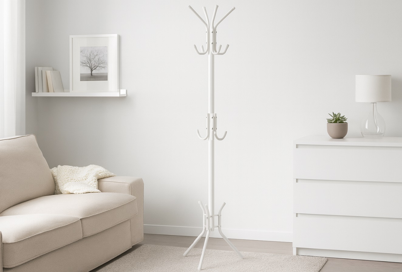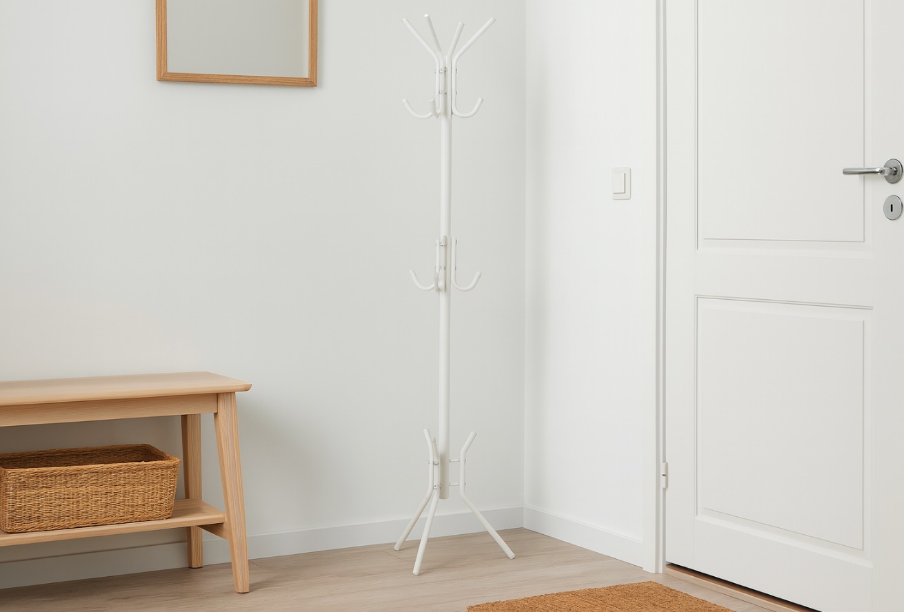 Vešiak OMER je voľne stojaci, predstavuje praktické, no zároveň elegantné riešenie pre každú domácnosť či pracovný priestor. Vďaka svojmu dizajnu nevyžaduje žiadne vŕtanie do stien, čo oceníš najmä v prípade prenájmu alebo pri častom presúvaní nábytku. Je ľahký a jednoducho prenosný, takže ho môžeš bez námahy premiestniť tam, kde ho práve potrebuješ. Svojou univerzálnosťou sa dokonale hodí do predsiene, šatne alebo dokonca do kancelárie. Moderné línie a minimalistický tvar vešiaka v bielej farbe pridávajú interiéru štýlový akcent, ktorý sa ľahko kombinuje s rôznymi druhmi zariadenia – od industriálneho až po škandinávsky štýl.