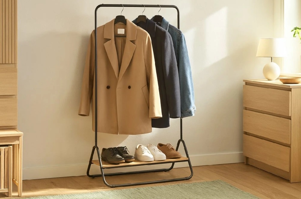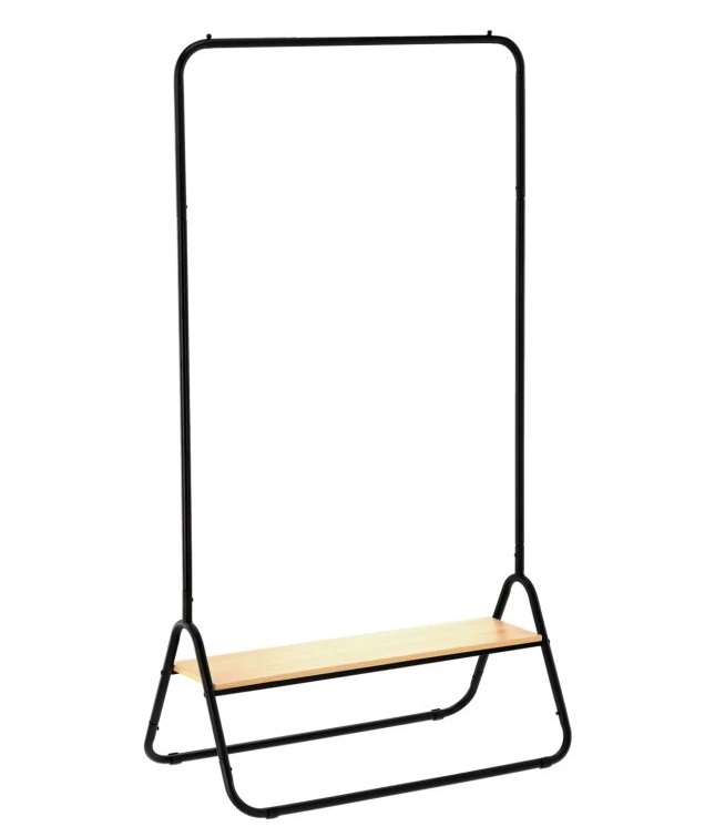 Dodajte svojmu interiéru nádych moderného loftového štýlu pomocou voľne stojaceho vešiaka BAMBSI s jednou policou. Tento praktický a elegantný kus nábytku je ideálny do predsiene, šatníka aj kancelárie. Vďaka mobilnej konštrukcii nevyžaduje vŕtanie ani montáž na stenu, takže ho môžete jednoducho premiestniť podľa potreby. Vešiak ponúka jednu priestrannú policu vhodnú na uloženie topánok, tašiek alebo úložných košov a štyri pevné háčiky na zavesenie kabátov, búnd, šálov či kabeliek. Stabilná kovová konštrukcia zabezpečuje pevnosť a spoľahlivosť pri každodennom používaní. Kombinácia čiernej farby a drevopodobných prvkov pôsobí moderne a zároveň univerzálne, takže sa hodí do rôznych typov interiérov.