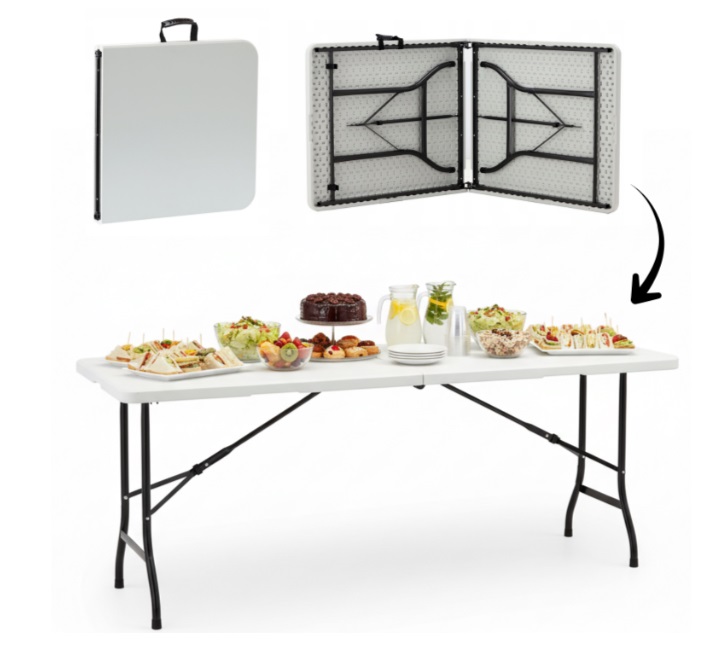 Záhradný skladací stôl ZUM9606 s dĺžkou 180 cm je veľmi praktický a ľahký, vzhľadom na svoje rozmery váži iba 10,5 kg. Stôl skvele sa hodí na rodinné oslavy v záhrade, svadby pod holým nebom, kempovanie alebo na predajné stánky. Stabilná konštrukcia a pevný oceľový rám zaisťujú bezpečné používanie aj pri maximálnom zaťažení až 150 kg. Nohy so spoločnými podpormi a blokádou poskytujú dodatočnú stabilitu.