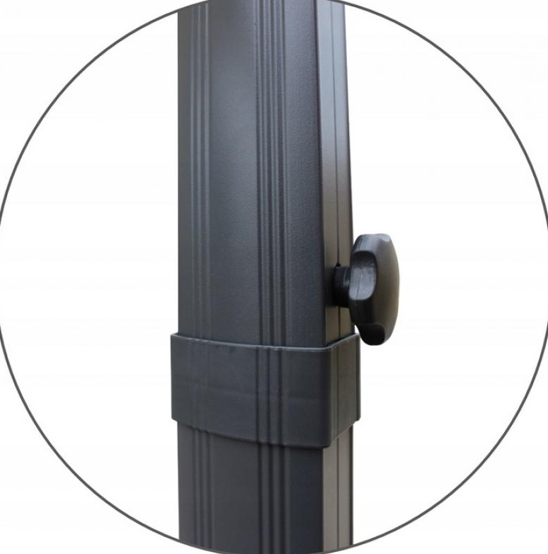 Stojaci profil je vyrobený z kvalitného hliníka s povrchovou úpravou práškovým lakovaním. Zavesený profil taktiež pozostáva z hliníka a je ošetrený rovnakou práškovou farbou, ktorá zaručuje odolnosť a estetický vzhľad. Stabilitu zabezpečuje podstavec s krížovou základňou z robustnej ocele, ktorá poskytuje spoľahlivú oporu. Strieška je z vodeodolného materiálu poskytuje spoľahlivú ochranu pred nepriazňou počasia. Jednoduché skladanie a rozkladanie umožňuje praktická kľuka.