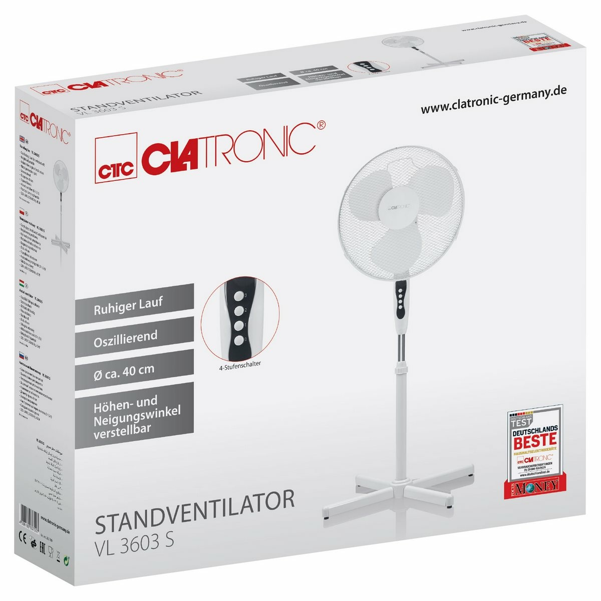 Stojanový ventilátor VL 3603 S s nastaviteľnou výškou od 110 do 125 cm a priemerom vrtule 40 cm. Výhodou je funkcia oscilácie, ktorá môže byť vypnutá a nastaviteľný uhol sklonu. Vrtuľa je chránená kovovou ochrannou mriežkou. Vďaka pevnej základni a protišmykovej úprave nožičiek je zaručená vysoká stabilita. Hlučnosť od 38 do 44 dB.Ventilátor je možné prevádzkovať v 3 rýchlostiach. Napájanie je 230 V, 50/60 Hz.