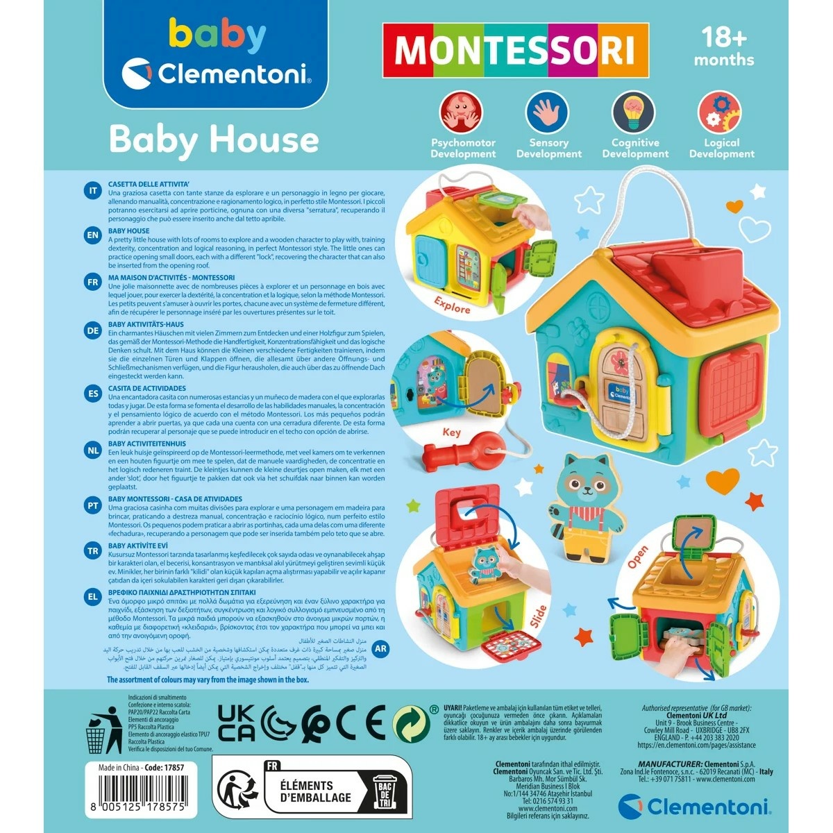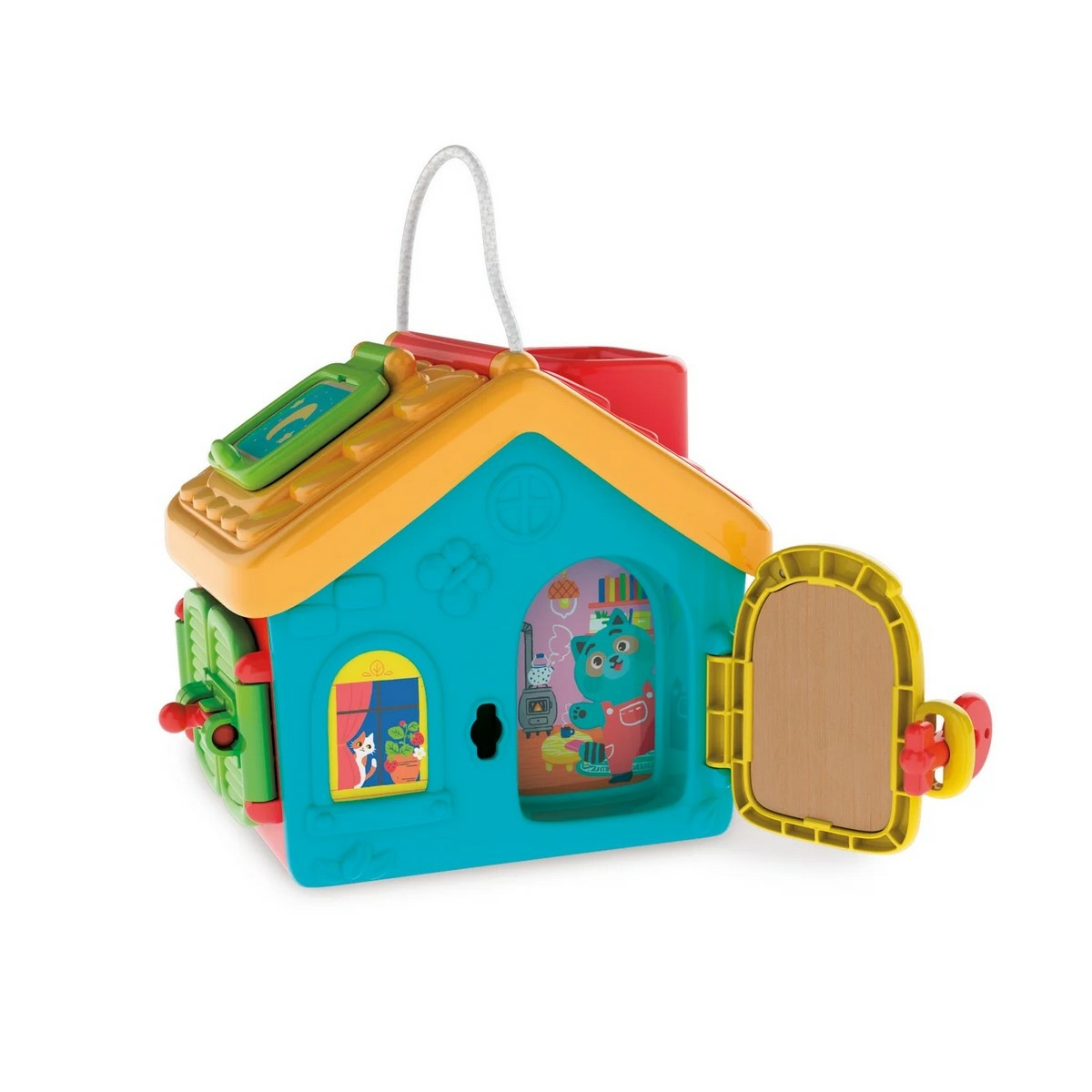 Interaktívna sada – domček s mnohými rôznymi funkciami a figúrkou na hranie. Hračka inšpirovaná Montessori metódou plní funkciu skutočnej cvičebnej sady, ktorá zlepšuje jemnú motoriku a zároveň učí používať predmety každodennej potreby. Dieťa, ktoré objavuje vnútro domčeka, precvičuje schopnosť otvoriť všetky dvierka a rôzne uzávery. Balenie: 21 x 24 x 17 cm. Vek: 18 m+