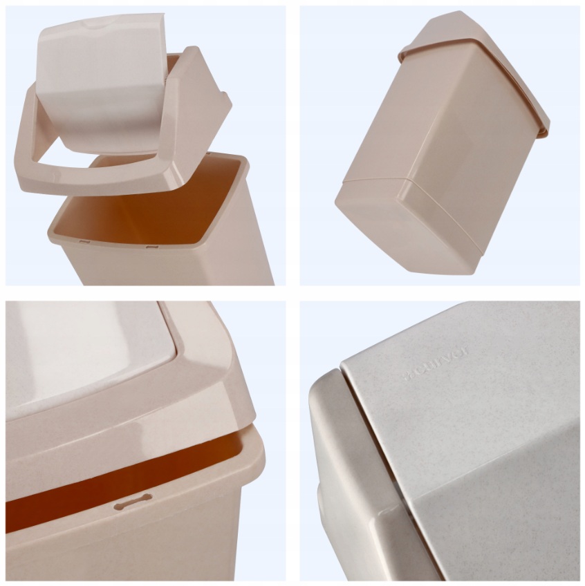 Odpadkový kôš je vyrobený z kvalitného plastu, ktorý sa používa najmä vďaka svojej ľahkosti, odolnosti, tvarovateľnosti a nízkej cene. Materiál je ľahko umývateľný a odolný voči poškodeniu, je obľúbený kvôli nízkej hmotnosti.