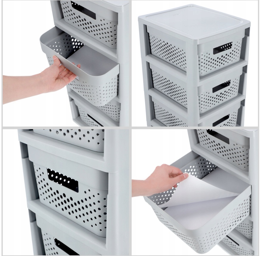 Zásuvkový regál je vyrobený z kvalitného plastu, ktorý sa používa najmä vďaka svojej ľahkosti, odolnosti a tvarovateľnosti. Materiál je ľahko umývateľný a odolný voči poškodeniu, je obľúbený kvôli nízkej hmotnosti. Zásuvkový regál sa ľahko udržiava, stačí ho pretrieť handričkou namočenou v jemnom saponáte a aj po rokoch bude vyzerať ako nový.