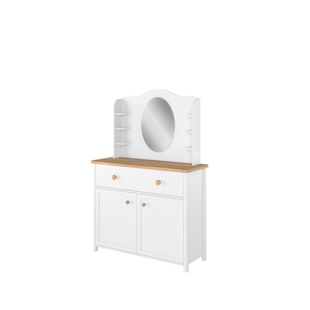 Detský sektorový nábytok LORRY je tou ideálnou voľbou pre všetky detské izby, ktoré chcú vyžarovať romantickým nádychom. Zostava detského sektorového nábytku LORRY je vyrobená v jemných farbách a tvaroch tak, aby bola vhodná pre dievčatá i chlapcov. Charakteristickou črtou pre detský sektorový nábytok je elegantné biele matné farebné prevedenie, ktoré vkusne dopĺňa svetlo – hnedá farba dub nash. Kolekcia detského nábytku LORRY navyše pozostáva z niekoľkých jednotlivých prvkov, ktoré sa dajú spolu veľmi jednoducho kombinovať, a tak prináša priestor pre kreatívne a variabilné umiestnenie. Komoda LORRY SO – 05 / 2D1S je dodávaná bez toaletky. Tú je v prípade záujmu potrebné doobjednať.