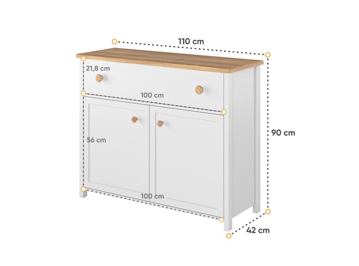 Nábytok je vyrobený z kvalitného a pevného lamina v hrúbke 16 mm, vrchná doska v hnedej farbe je v hrúbke 25 mm. Laminovaná doska je zakončená odolnou ABS hranou. Zadná časť nábytku a dno zásuvky sú z odolnej HDF v hrúbke 3 mm. Čistenie je jednoduché, stačí zotrieť navlhčenou handričkou alebo prípravkom určeným na nábytok. Kvôli bezpečnosti a zachovaniu primeranej stability nábytku, by mal byť trvalo pripevnený k stene.