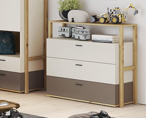 Hľadáte ideálnu komodu, ktorá bude vyhovovať tínedžerovi a ponúkne nielen praktické úložné riešenie, ale aj štýlový doplnok detskej izby? Decentná a univerzálna kombinácia béžovej, truflovej a umeleckého dubového dekoru robí túto komodu NELLY LY – 06 perfektne vhodnou do izieb pre dievčatá aj chlapcov bez ohľadu na vek. Komoda je navrhnutá tak, aby vyhovovala potrebám vášho dieťaťa a pomáhala mu udržiavať poriadok v súkromnom priestore.