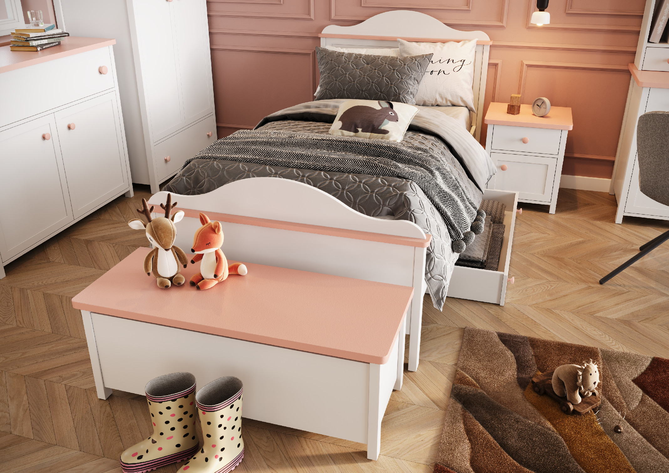 Nábytok je vyrobený z kvalitného a odolného lamina v hrúbke 16 mm, vrchná doska v ružovej farbe je v hrúbke 18 mm. Zadná časť nábytku a dno zásuvky sú z odolnej HDF v hrúbke 3 mm. Laminovaná doska je zakončená odolnou ABS hranou. Čistenie je jednoduché, stačí zotrieť navlhčenou handričkou alebo prípravkom určeným na nábytok. Pre väčšiu bezpečnosť je odporúčané nábytok pripevniť k stene.