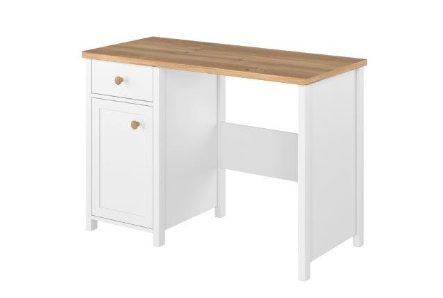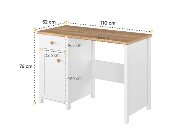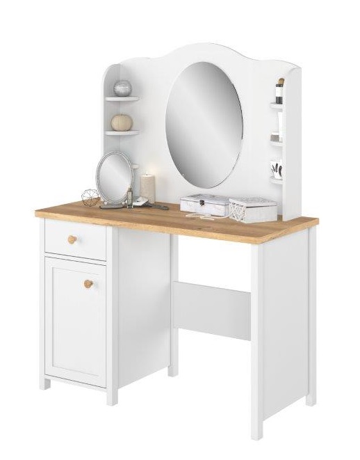 Detský sektorový nábytok LORRY je tou ideálnou voľbou pre všetky detské izby, ktoré chcú vyžarovať romantickým nádychom. Zostava detského sektorového nábytku LORRY je vyrobená v jemných farbách a tvaroch tak, aby bola vhodná pre dievčatá i chlapcov. Charakteristickou črtou pre detský sektorový nábytok je elegantné biele matné farebné prevedenie, ktoré vkusne dopĺňa svetlo – hnedá farba dub nash. Kolekcia detského nábytku LORRY navyše pozostáva z niekoľkých jednotlivých prvkov, ktoré sa dajú spolu veľmi jednoducho kombinovať, a tak prináša priestor pre kreatívne a variabilné umiestnenie. Písací stolík LORRY SO – 03 / 1D1S je dodávaný bez nadstavca a bez toaletky, tie je v prípade záujmu potrebné doobjednať.