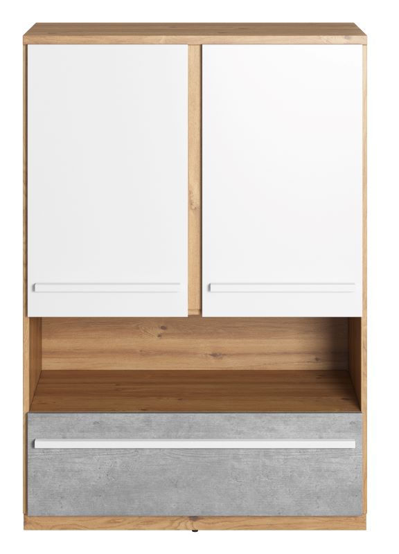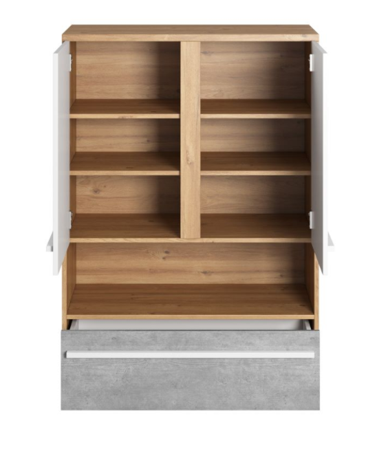 Nábytok je vyrobený z kvalitného a pevného lamina v hrúbke 16 a 25 mm. Zadná časť nábytku a dno zásuvky sú z odolnej HDF v hrúbke 3 mm. Úchyty majú prevedenie praktickej MDF lišty. Čistenie je jednoduché, stačí zotrieť navlhčenou handričkou alebo prípravkom určeným na nábytok. Pre väčšiu bezpečnosť je odporúčané nábytok pripevniť k stene.