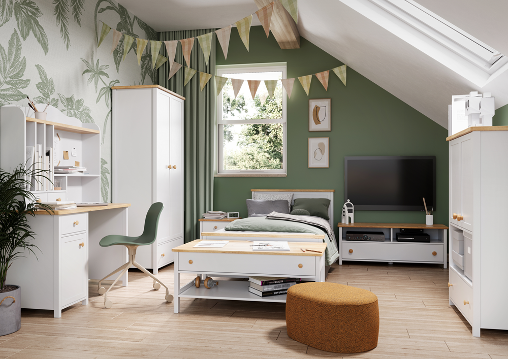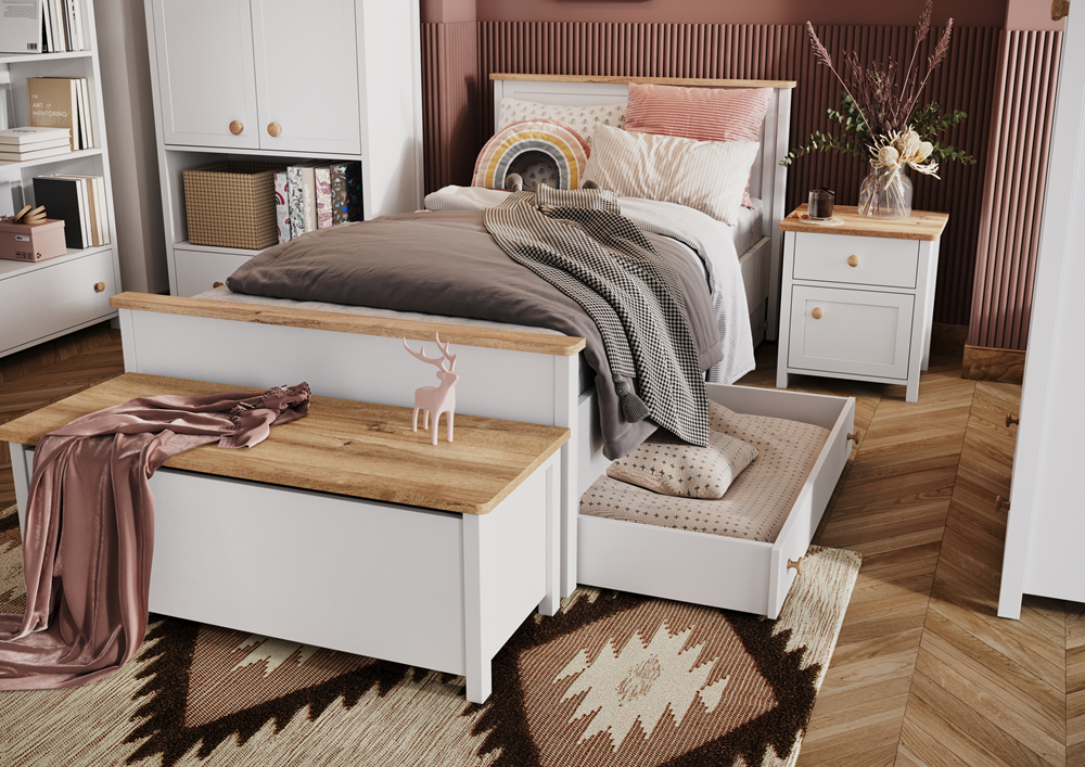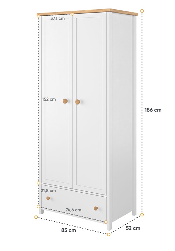 Detský sektorový nábytok LORRY je tou ideálnou voľbou pre všetky detské izby, ktoré chcú vyžarovať romantickým nádychom. Zostava detského sektorového nábytku LORRY je vyrobená v jemných farbách a tvaroch tak, aby bola vhodná pre dievčatá i chlapcov. Charakteristickou črtou pre detský sektorový nábytok je elegantné biele matné farebné prevedenie, ktoré vkusne dopĺňa svetlo – hnedá farba dub nash. Kolekcia detského nábytku LORRY navyše pozostáva z niekoľkých jednotlivých prvkov, ktoré sa dajú spolu veľmi jednoducho kombinovať, a tak prináša priestor pre kreatívne a variabilné umiestnenie. Šatníková skriňa LORRY je dvojdverová, so zásuvkou v spodnej časti.