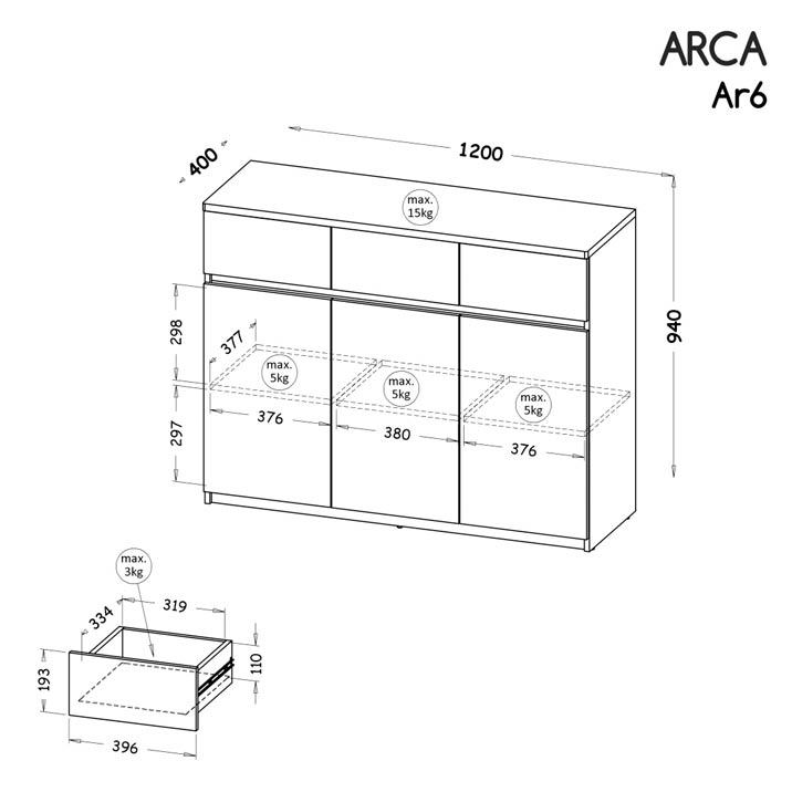 Špecifikácia pre produkt: Dolmar Komoda ARCHA AR6 Farba: dub wotan / biela