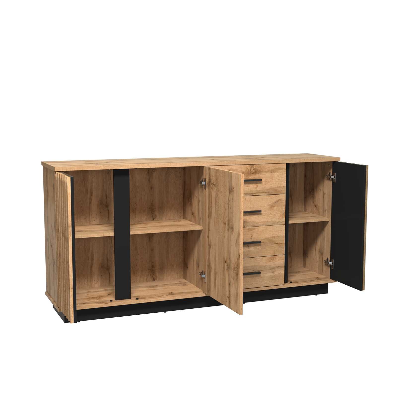 Pokiaľ si chcete zariadiť obývačku s jedálňou alebo s pracovňou identicky, máme pre Váš riešenie. Prepracovaná komoda CARMELO LA21 ponúka množstvo úložného priestoru, má 3 dvierka a 4 zásuvky. Lamely sú čoraz viac populárnejšie a vďaka čiernemu podkladu pôsobí zostava opticky väčšia. Celkový dojem dotvára čierny sokel a jednoduché čierne úchyty, ktoré v kombinácii s dubom wotan pôsobia veľmi elegantne.