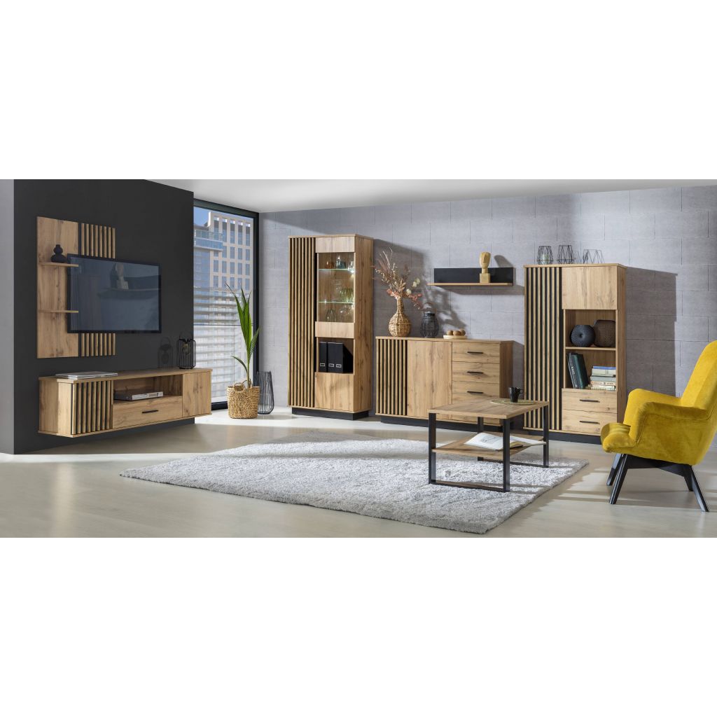 Pokiaľ si chcete zariadiť obývačku s jedálňou alebo s pracovňou identicky, máme pre Váš riešenie. Prepracovaná zostava nábytku CARMELO ponúka množstvo prvkov v štýlovom prevedení v obľúbenej farebnej kombinácii dubu s čiernou. Lamely sú čoraz viac populárnejšie a vďaka čiernemu podkladu pôsobí zostava opticky väčšia. Celkový dojem dotvára čierny sokel a jednoduché čierne úchyty, ktoré v kombinácii s dubom wotan pôsobia veľmi elegantne. Komoda CARMELO LA5 má štyri zásuvky a dvierka s lamelami. Oceníte dostatok úložného priestoru a štýlové prevedenie komody.