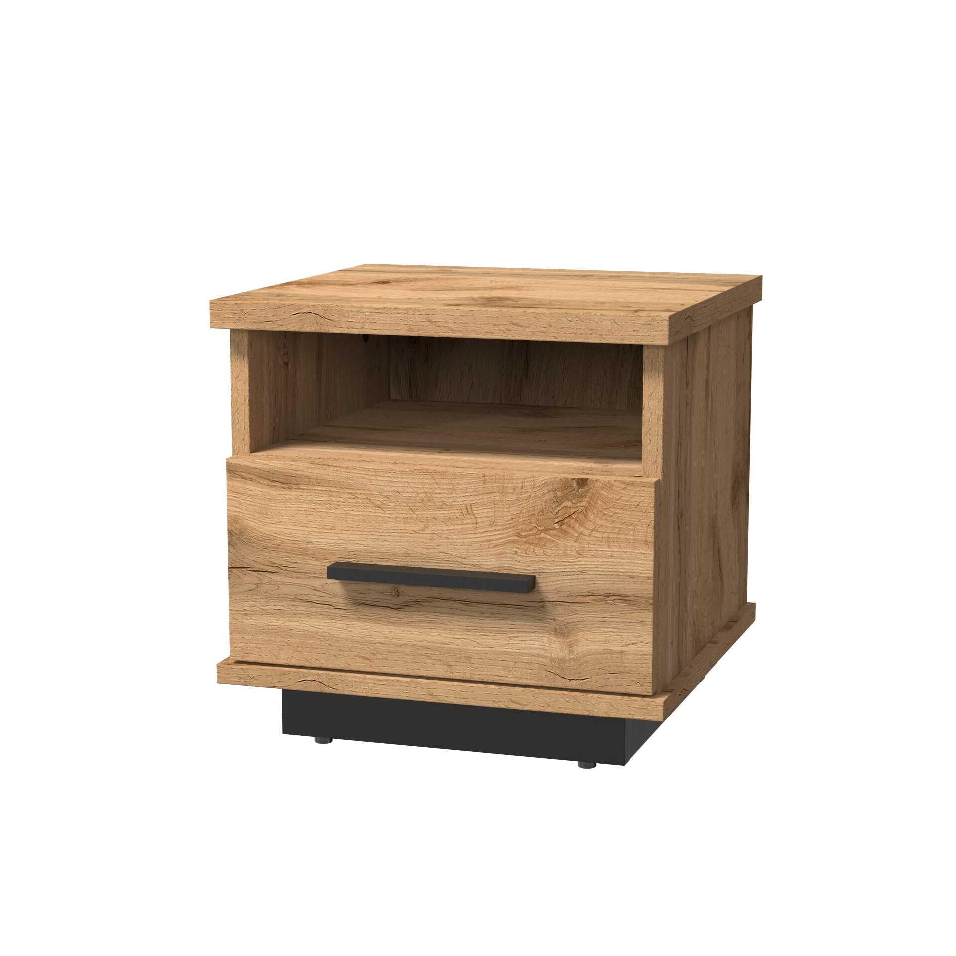 Ak chcete zjednotiť vzhľad obývačky s jedálňou alebo spálňou, máme pre vás ideálne riešenie. Nábytková zostava CARMELO ponúka množstvo štýlových prvkov v populárnej farebnej kombinácii dubu a čiernej. Lamely, ktoré sú stále viac obľúbené, vyniknú na čiernom podklade a dodávajú zostave optickú priestrannosť. Elegantný vzhľad dopĺňa čierny sokel a jednoduché čierne úchyty, ktoré v kombinácii s dubom wotan vytvárajú sofistikovaný dojem. Nočný stolík CARMELO LA17 má jednu zásuvku a jednu otvorenú policu. Oceníte dostatok úložného priestoru a štýlové prevedenie.