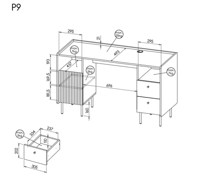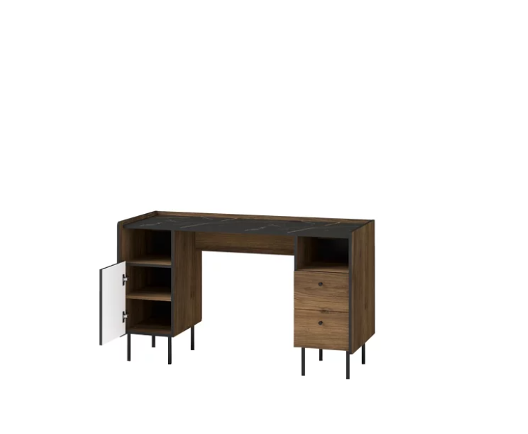 Písací stolík ESPRITE P9 v neodolateľnom farebnom prevedení orech warmia v kombinácií san sebastian a matná čierna. Zvolená kombinácia farieb a elegantné čierne kovové nožičky s práškovým nástrekom vytvárajú jedinečný dizajn. Výška nožičiek je 16 cm. Nožičky zaručujú pevnú stabilitu nábytku. Písací stôl má na ľavej strane dvierka, za ktorými sa nachádza praktická polica na uloženie väčších predmetov, a nad nimi je umiestnená otvorená polica pre rýchly prístup k potrebným veciam. Pravá strana stola obsahuje dve zásuvky na uskladnenie písacích potrieb a nad nimi je ďalšia otvorená polica na často používané predmety.