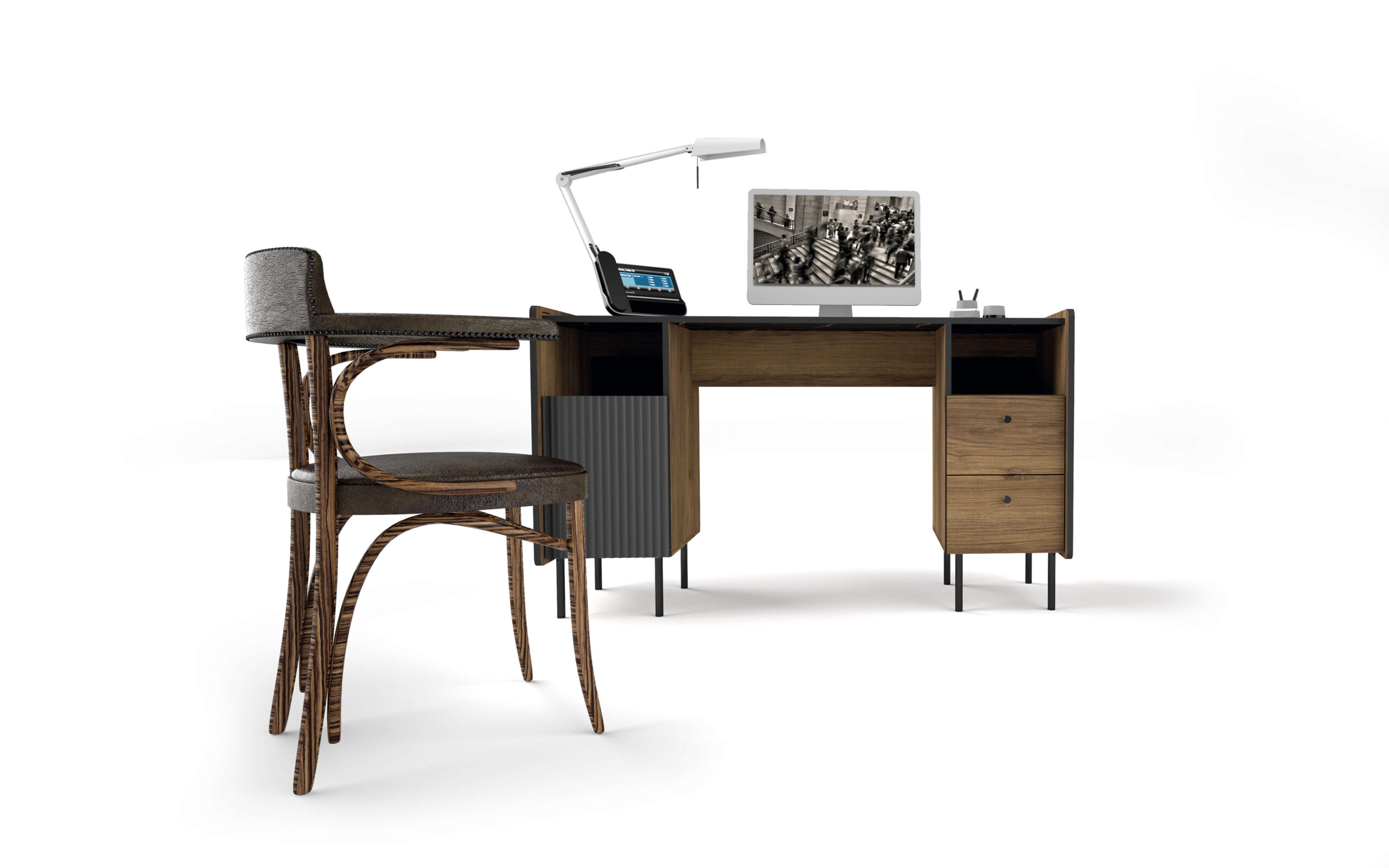 Písací stôl je vyrobený z laminovanej dosky s dekoratívnymi prvkami z drážkovanej MDF, má plastové úchytky a stabilné kovové nožičky pre moderný vzhľad a praktickosť. Na zachovanie vzhľadu stola stačí pravidelne utierať povrch jemnou vlhkou handričkou.