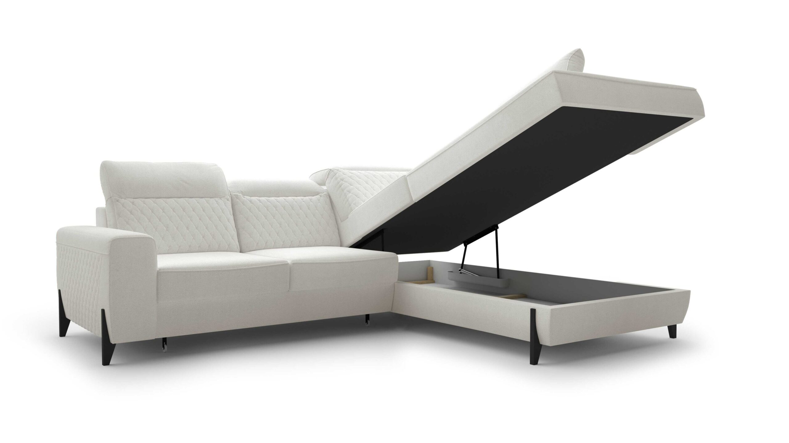 Kostra sedačky je vyrobená z mäkkého a tvrdého dreva – z drevotriesky. Sedenie pohovky je vybavené falistovými pružinami pre optimálne pruženie. Na čalúnenie sedacej plochy a opierok je použitá kvalitná PUR pena. Kovové nohy rohovej sedacej súpravy dodávajú miestnosti výrazný nádych elegancie. Sedačku je možné naimpregnovať alebo v prípade potreby vyčistiť univerzálnym čističom.