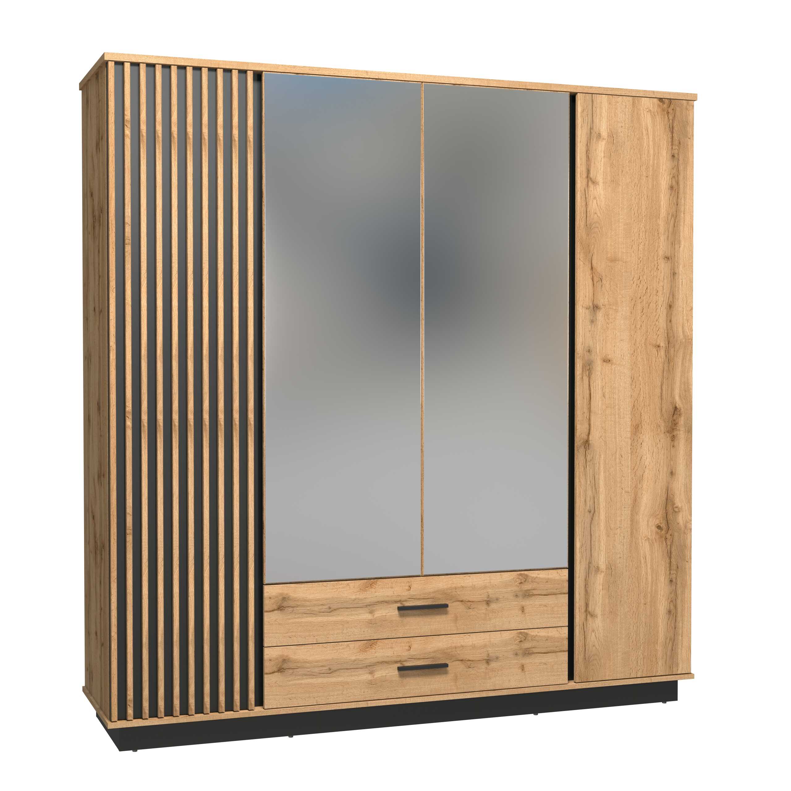 Pokiaľ si chcete zariadiť spálňu, máme pre Váš riešenie. Prepracovaná šatníková skriňa CARMELO LA18 ponúka množstvo úložného priestoru prevedení v obľúbenej farebnej kombinácii dubu s čiernou. Lamely sú čoraz viac populárnejšie a vďaka čiernemu podkladu pôsobí zostava opticky väčšia. Celkový dojem dotvára čierny sokel a jednoduché čierne úchyty, ktoré v kombinácii s dubom wotan pôsobia veľmi elegantne. Šatníková skriňa CARMELO LA18 je štvordverová s dvomi zásuvkami, jedny dvierka z toho sú s lamelami. Oceníte dostatok úložného priestoru a štýlové prevedenie skrine.