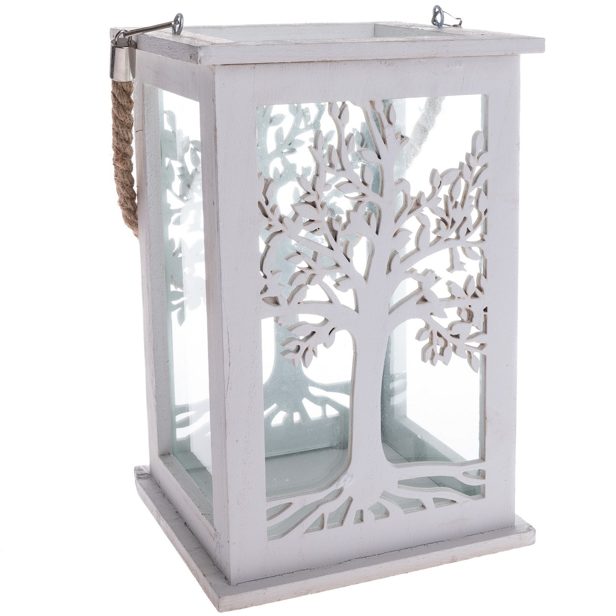 Závesný lampáš s reliéfom stromu v bielej farbe vykúzli jedinečnú a útulnú atmosféru v intériéri aj na terase.Vzhľadom k svojmu dizajnu bude lampáš dokonalou ozdobou rustikálneho a dedinského štýlu. Príjemná atmosféra, navodená svetlom sviečky alebo svetielok prestupujúca z lampáša cez obrysy stromu na stenách, nadchne každého.Lampáš je možné umiestniť na poličku, komodu, položiť na zem alebo pomocou pútka z lana zavesiť. Záleží len na vás a vašom výbere ideálneho miesta na prezentáciu lampáša.