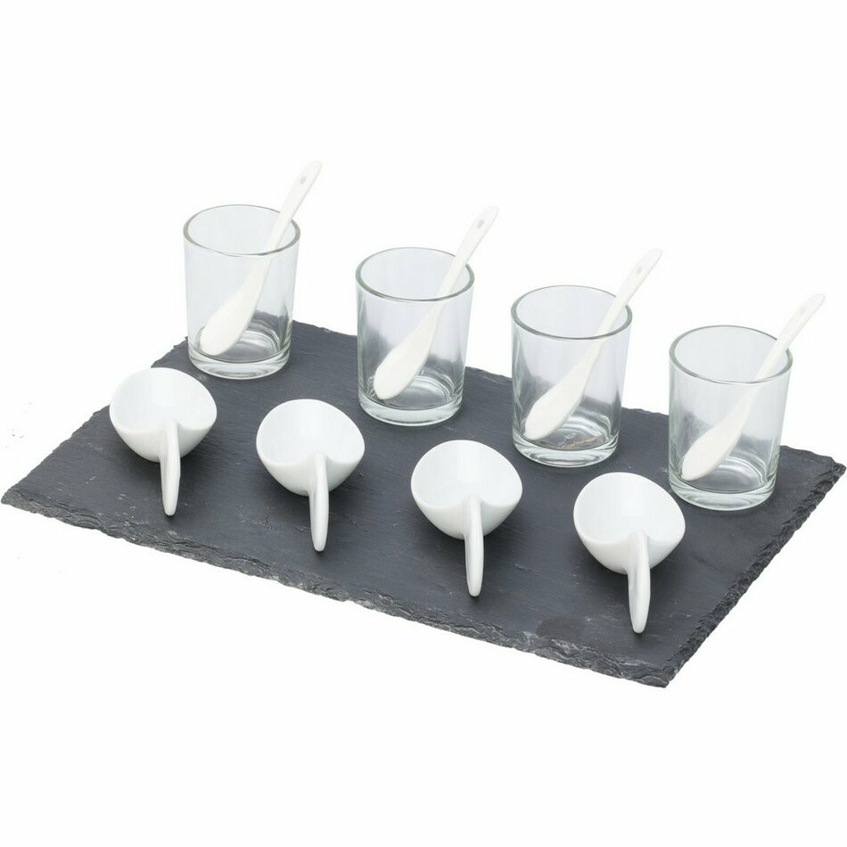 Elegantný servírovací set mištičiek, pohárov a lyžičiek na bridlicovom podnose pre najrôznejšie príležitosti, slávnostné aj tie všedné si nájde miesto aj vo vašej domácnosti. Perfektný na servírovanie predjedál, pochutín, dipov a omáčok. Jednoduchá údržba, možno umývať v umývačke riadu.Materiál: mištičky: porcelán, kalíšky: sklo, lyžičky: porcelán a servírovacia tácka s protišmykovými nôžkami: bridlicaRozmery podnosu: 29,5 x 20 x 5 cm. Rozmery pohárov: pr. 4,2 x v. 6 cm.Obsah sady: