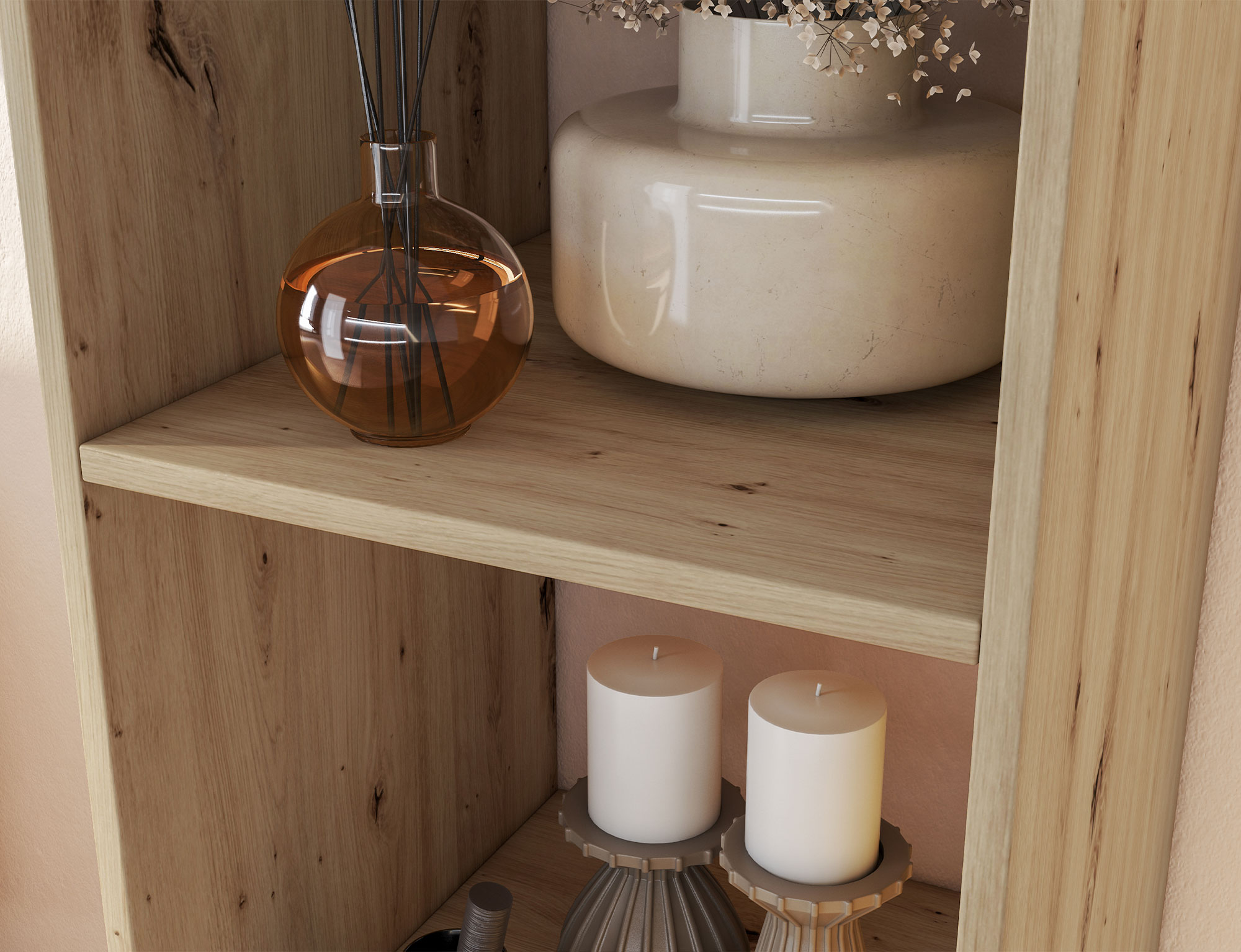 Knihovna Figgi v řemeslném dekoru dubu je příkladem moderního designu inspirovaného přírodou. Její jemné, hřejivé barevné provedení ve vzhledu dubového dřeva dodává interiéru útulnou a zároveň nadčasovou eleganci. Skvěle se proto hodí do obývacího pokoje, ložnice nebo pracovny – jinými slovy všude tam, kde je důležitý soulad s okolím. Štíhlý tvar vertikálního podstavce s otevřenými policemi umožňuje nábytku krásně zapadnout do prostředí ve skandinávském, modernistickém nebo loftovém stylu, kde bude vybízet k příjemnému odlehčení na pohled.