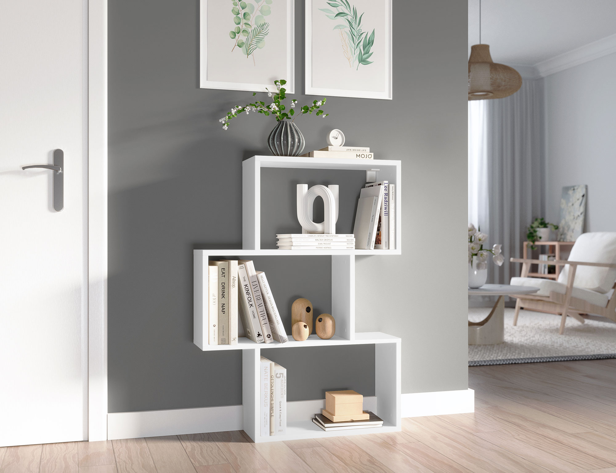 Bílá knihovna Evertti je nejen dekorativní, ale také praktický kus nábytku. Laminovaná dřevotřísková deska a povrchová úprava z PVC jí dodávají značnou odolnost a zajišťují, že si po dlouhou dobu zachová svůj elegantní vzhled. Díky použitým materiálům navíc každá police unese až 3 kg! Z tohoto důvodu je regál vhodný k ukládání – a vystavování! – knih, ozdob nebo jiných potřebných předmětů. Bílé kluzáky pěkně zapadají do celku, zajišťují stabilitu a chrání podlahu před poškrábáním.
