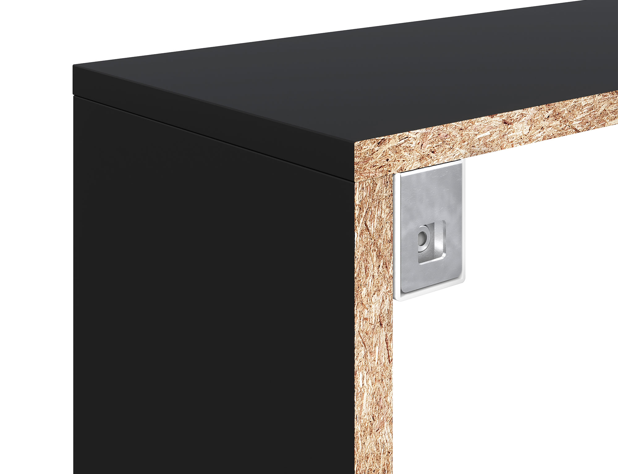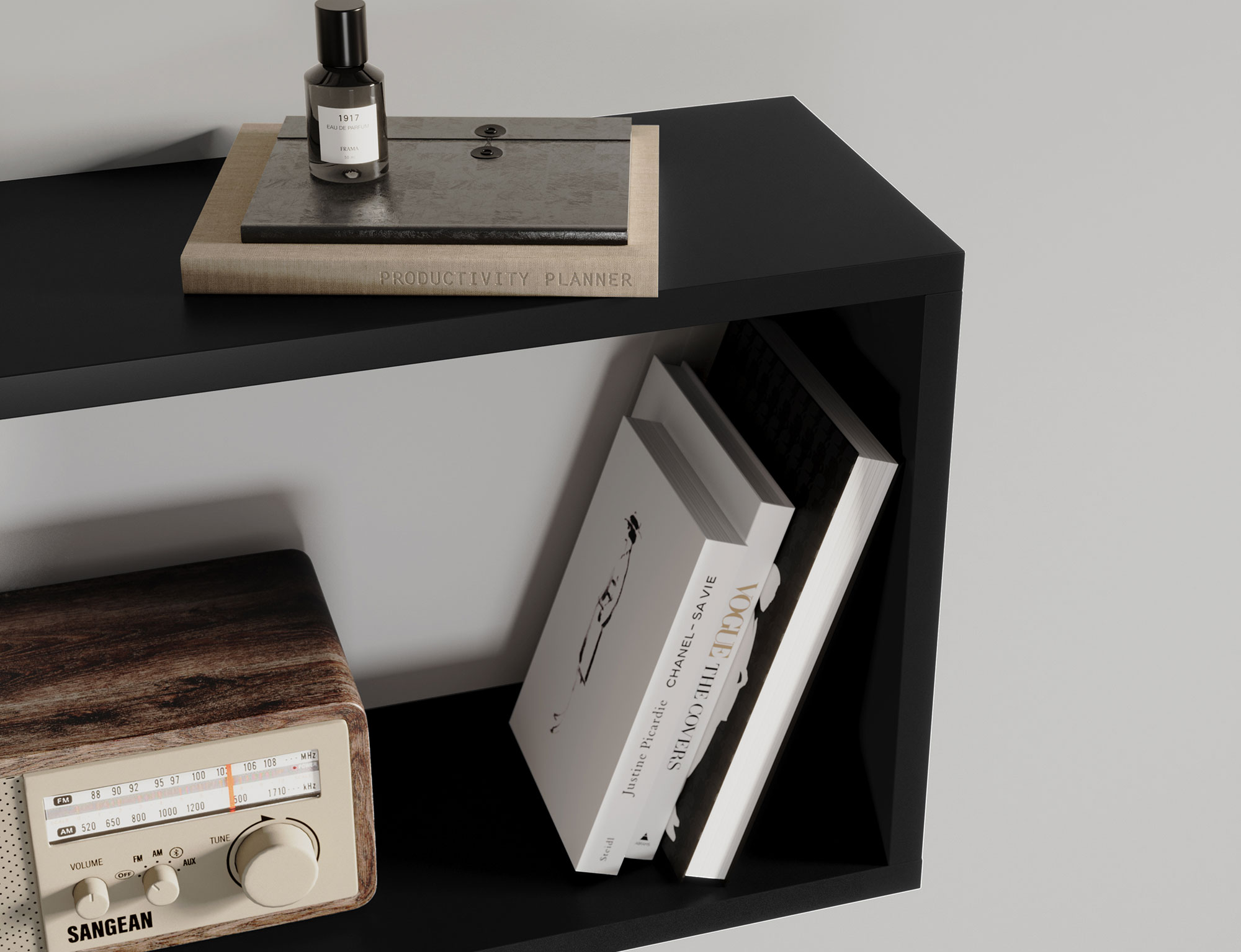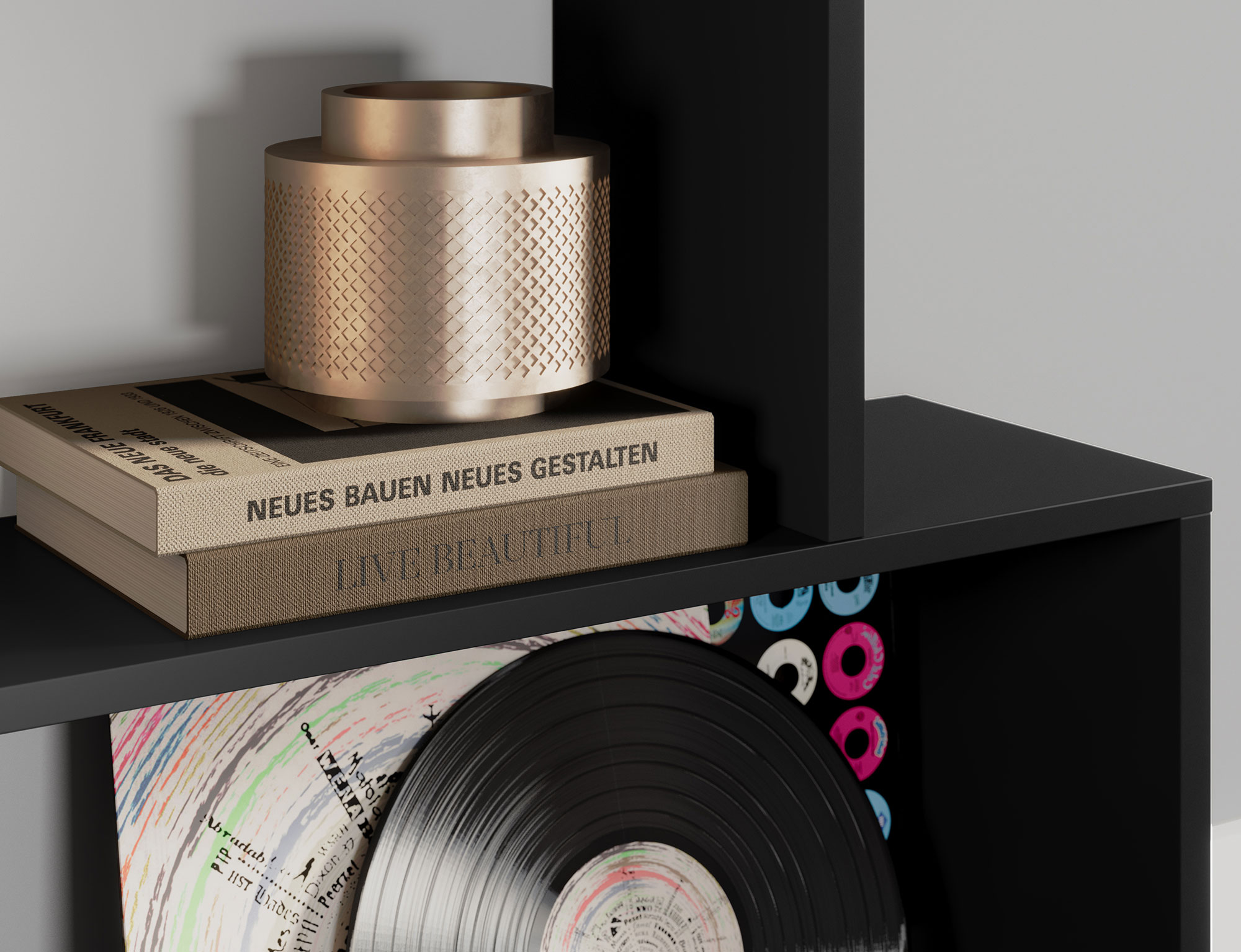 Černá knihovna Evertti je nejen dekorativní, ale také praktický kus nábytku. Laminovaná dřevotřísková deska a povrchová úprava z PVC jí dodávají značnou odolnost a zajišťují, že si po dlouhou dobu zachová svůj elegantní vzhled. Díky použitým materiálům navíc každá police unese až 3 kg! Z tohoto důvodu je regál vhodný k ukládání – a vystavování! – knih, ozdob nebo jiných potřebných předmětů. Černé kluzáky pěkně zapadají do celku, zajišťují stabilitu a chrání podlahu před poškrábáním.