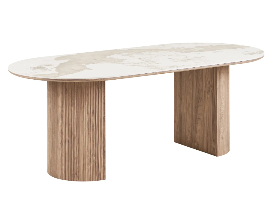 Keramický povrch je nielen krásny, ale aj mimoriadne odolný voči poškriabaniu a teplu, čo zaručuje jednoduchú údržbu a dlhú životnosť. Okrúhla drevená podstava stola pôsobí stabilne a zároveň prináša do interiéru pocit tepla a prirodzenej estetiky.