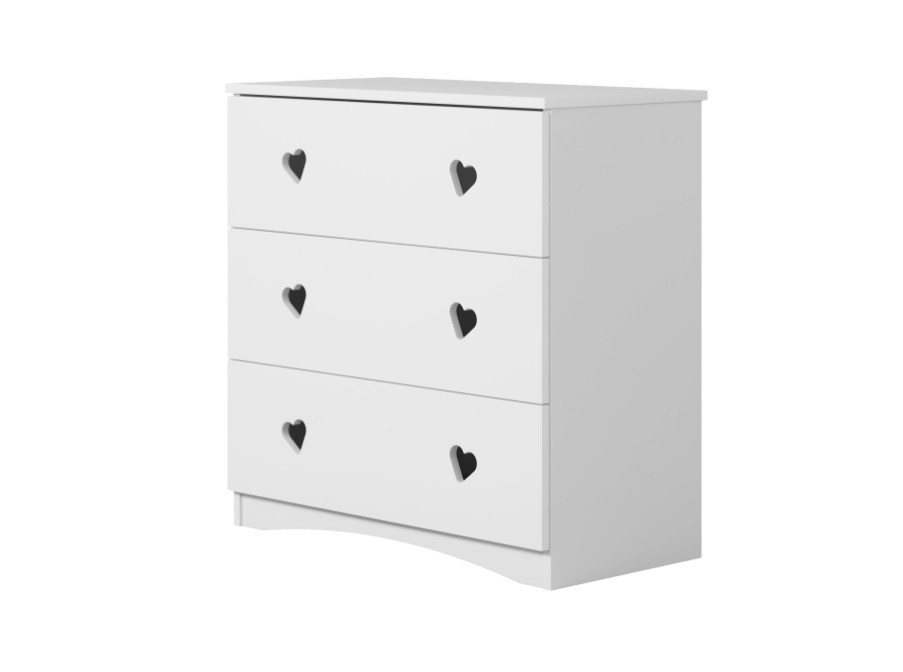 Komoda JULIA v bielej farbe sa vyznačuje ľahkým, no zároveň elegantným dizajnom a pôvabnými úchytkami. Nábytok Julia spája praktickosť s jemnou estetikou a vytvára útulný, harmonický interiér. Precízne spracované detaily a premyslené prvky potešia najmenších členov domácnosti, zatiaľ čo rodičia ocenia zabudované bezpečnostné systémy. Biele prevedenie sa ľahko kombinuje s rôznymi štýlmi zariadenia a vnáša do priestoru sviežosť a ľahkosť. Úchytky sú riešené ako ozdobné výrezy v tvare srdca, ktoré dodávajú komode jedinečný charakter.