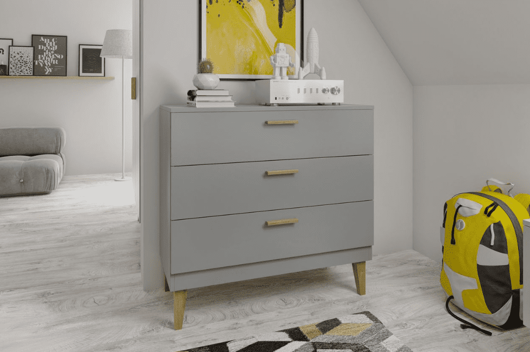 Praktická komoda KUBI v nadčasovom sivom prevedení je ideálnym riešením pre tých, ktorí hľadajú spojenie funkčnosti a štýlu. Svojím minimalistickým vzhľadom, drevenými nožičkami a čistými líniami perfektne zapadne do modernej spálne, obývačky či detskej izby. Neutrálna sivá farba pôsobí útulne a čisto, čím vytvára harmonickú atmosféru v interiéri.