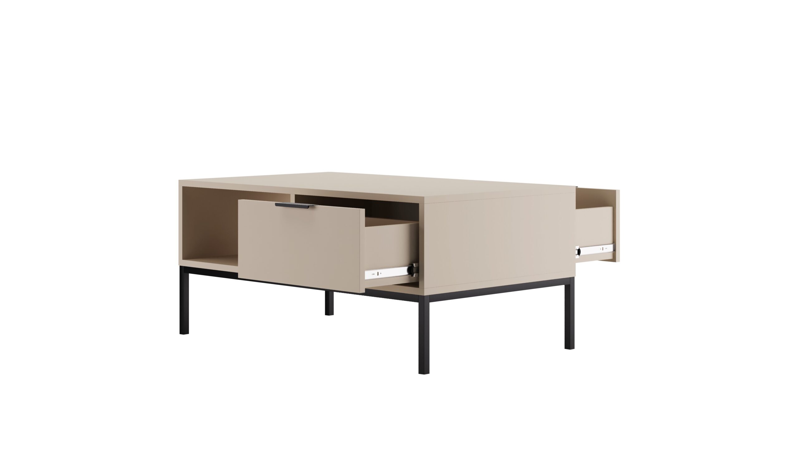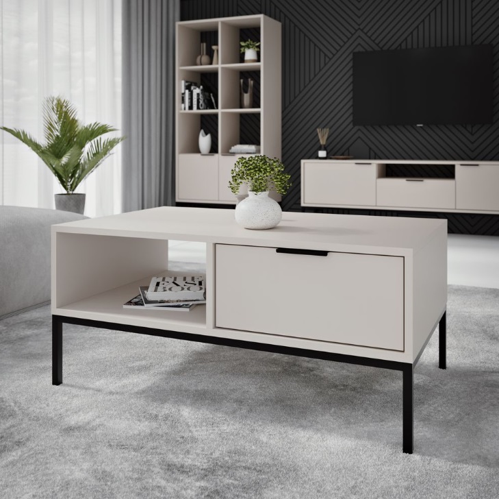 Dodajte svojmu interiéru nový nádych elegancie s konferenčným stolíkom AUSTIN 100 v modernom prevedení cashmere s kombináciou čiernych doplnkov. Tento štýlový kúsok spája čistý minimalistický dizajn s vysokou funkčnosťou, vďaka čomu je ideálnym doplnkom do každého domova. Konferenčný stôl ponúka dve priestranné zásuvky a otvorenú policu, ktoré vám poskytnú dostatok miesta na oblečenie, doplnky či ďalšie potrebné veci. Zásuvky sú osadené klasickými pojazdmi bez systému mäkkého dovierania.