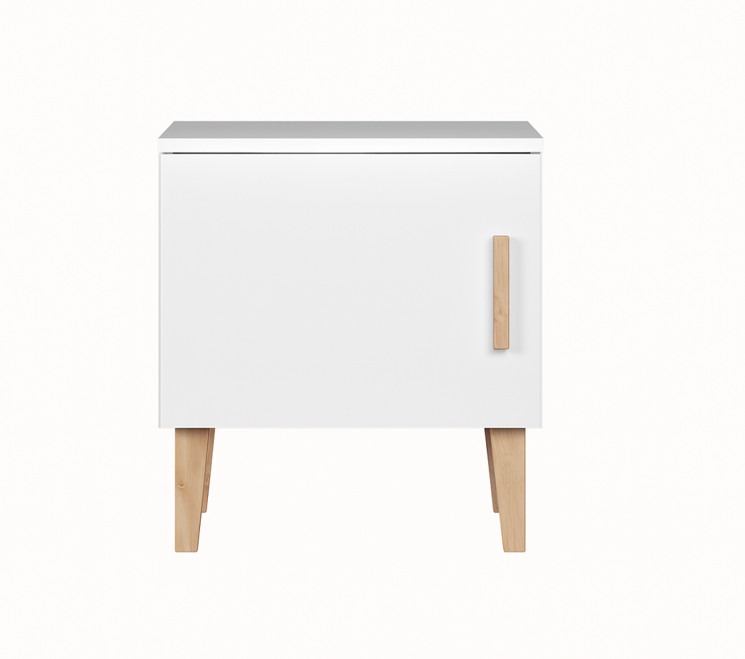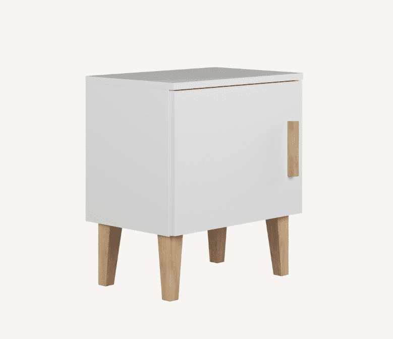 Moderný nočný stolík KUBI v neutrálne bielej farbe je ideálnym riešením pre každú spálňu, ktorá hľadá rovnováhu medzi štýlom a praktickosťou. Jeho minimalistický dizajn s drevenými nožičkami a úchytkou dodáva interiéru prirodzené teplo a jemnú eleganciu. Stolík ponúka praktický úložný priestor s dvierkami, do ktorého jednoducho uložíte knihy, drobnosti či osobné veci. Vrchná doska je dostatočne široká na lampu, pohár vody alebo budík – všetko, čo potrebujete mať po ruke pred spaním. Neutrálna béžová farba pôsobí útulne a čisto, čím vytvára harmonickú atmosféru v interiéri.