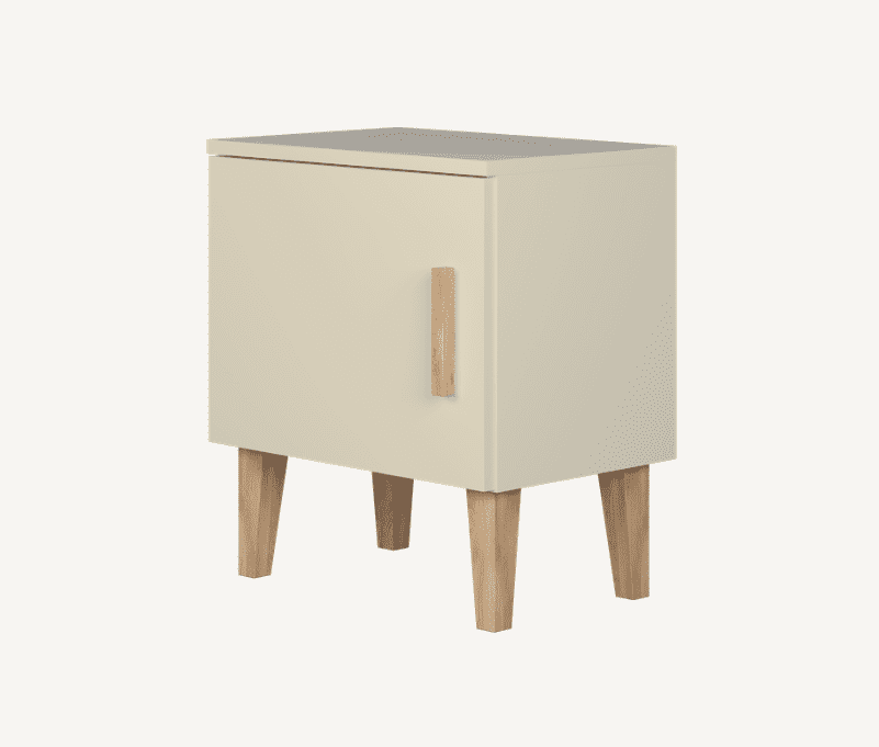 Moderný nočný stolík KUBI v príjemnom odtieni kašmír je ideálnym riešením pre každú spálňu, ktorá hľadá rovnováhu medzi štýlom a praktickosťou. Jeho minimalistický dizajn s drevenými nožičkami a úchytkou dodáva interiéru prirodzené teplo a jemnú eleganciu. Stolík ponúka praktický úložný priestor s dvierkami, do ktorého jednoducho uložíte knihy, drobnosti či osobné veci. Vrchná doska je dostatočne široká na lampu, pohár vody alebo budík – všetko, čo potrebujete mať po ruke pred spaním. Neutrálna béžová farba pôsobí útulne a čisto, čím vytvára harmonickú atmosféru v interiéri.