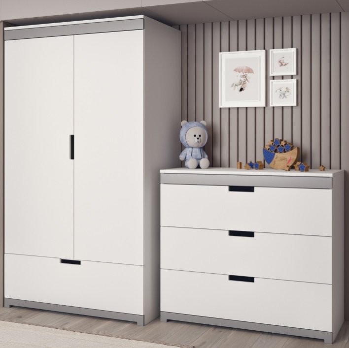 Šatníková skriňa je vyrobená z kvalitnej laminovanej drevotriesky s hrúbkou 18 mm. Predné časti tvoria MDF dosky lakované ekologickými certifikovanými farbami. Pre maximálnu bezpečnosť detí sú všetky hrany starostlivo zaoblené. Zásuvky sú na kvalitných guľôčkových výsuvoch. Na údržbu stačí mäkká handrička a je potrebné vyhýbať sa drôtenkám, abrazívnym povrchom a silným chemikáliám.
