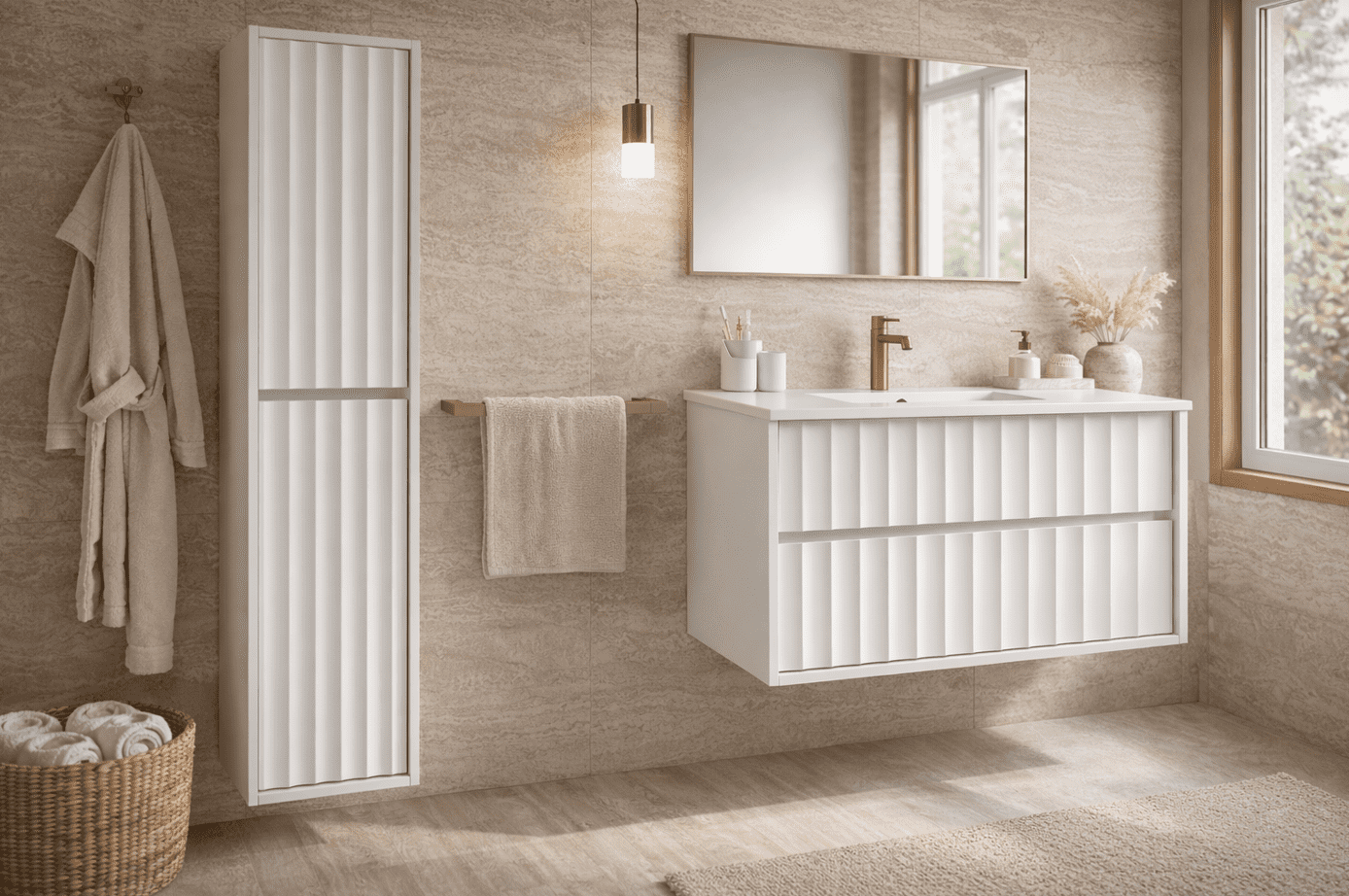 Vysoká kúpeľňová skrinka NOA je ideálnym doplnkom celej zostavy, ktorý ponúka veľkorysý úložný priestor bez narušenia vizuálnej čistoty kúpeľne. Vďaka štíhlemu tvaru, vertikálnemu frézovaniu a nadčasovému svetlému prevedeniu pôsobí vzdušne, moderne a mimoriadne elegantne. Je navrhnutá pre tých, ktorí chcú mať v kúpeľni všetko prehľadne usporiadané – štýlovo a bez kompromisov.