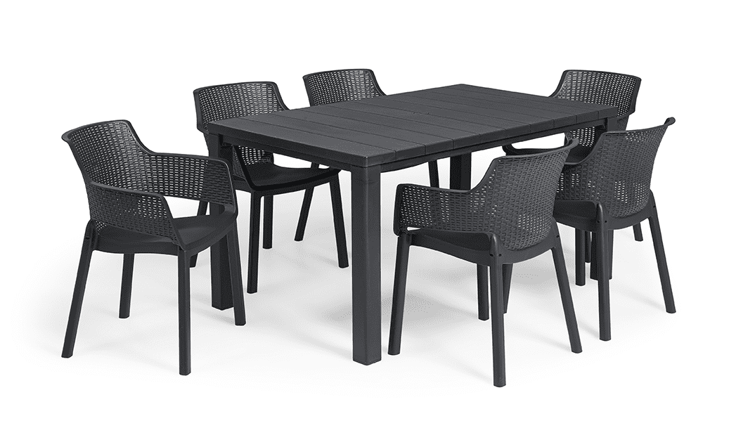 Exkluzívny záhradný plastový set ADLEY v prevedení grafit prinesie do vášho exteriéru štýlový a pohodlný dotyk. Plastový set ADLEY obsahuje kvalitný plastový stôl A 6 elegantných kresiel z kvalitného plastu. Investujte do kvalitného a štýlového záhradného plastového setu ADLEY a vytvorte si útulný a moderný kútik priamo vo vašej záhrade.