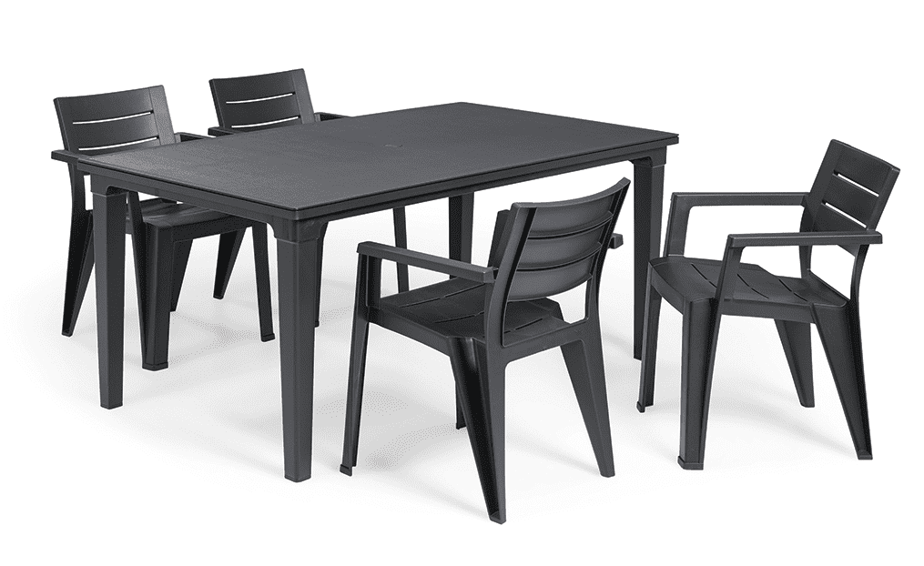 Exkluzívny záhradný plastový set ARIANA prinesie do vášho exteriéru štýlový a pohodlný dotyk. Set obsahuje kvalitný plastový stôl spolu so štyrmi elegantnými stoličkami, vytvárajúc tak ideálnu atmosféru pre relaxáciu a pohodu vo vašom záhradnom raji. Kombinácia jemných línií a praktických tvarov vytvára esteticky príjemné prostredie pre rodinné stretnutia, grilovanie alebo jednoduché oddychovanie na čerstvom vzduchu. Set je vyrobený z kvalitného plastu, ktorý zabezpečuje odolnosť voči poveternostným podmienkam a dlhú životnosť. Plastový materiál je ľahký, ale zároveň dostatočne pevný, čo zaručuje stabilitu a bezpečnosť počas používania. Užívajte si pohodlie, eleganciu a radostné chvíle v spoločnosti svojich blízkych v tomto skvele navrhnutom záhradnom sete.