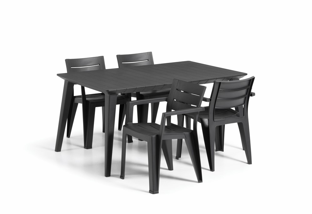 Praktická záhradná zostava KENZIE je moderný set vyrobený z kvalitného a pevného plastu. Záhradný plastový set KENZIE vo farbe grafit obsahuje 4 stoličky s pevnou konštrukciou a ľahký, ale pevný stôl. Celý set je odolný voči UV žiareniu a poveternostným podmienkam. Oživte svoju terasu alebo záhradu so záhradným plastovým setom KENZIE grafit a prenesiete sa do sveta pokoja a harmónie.