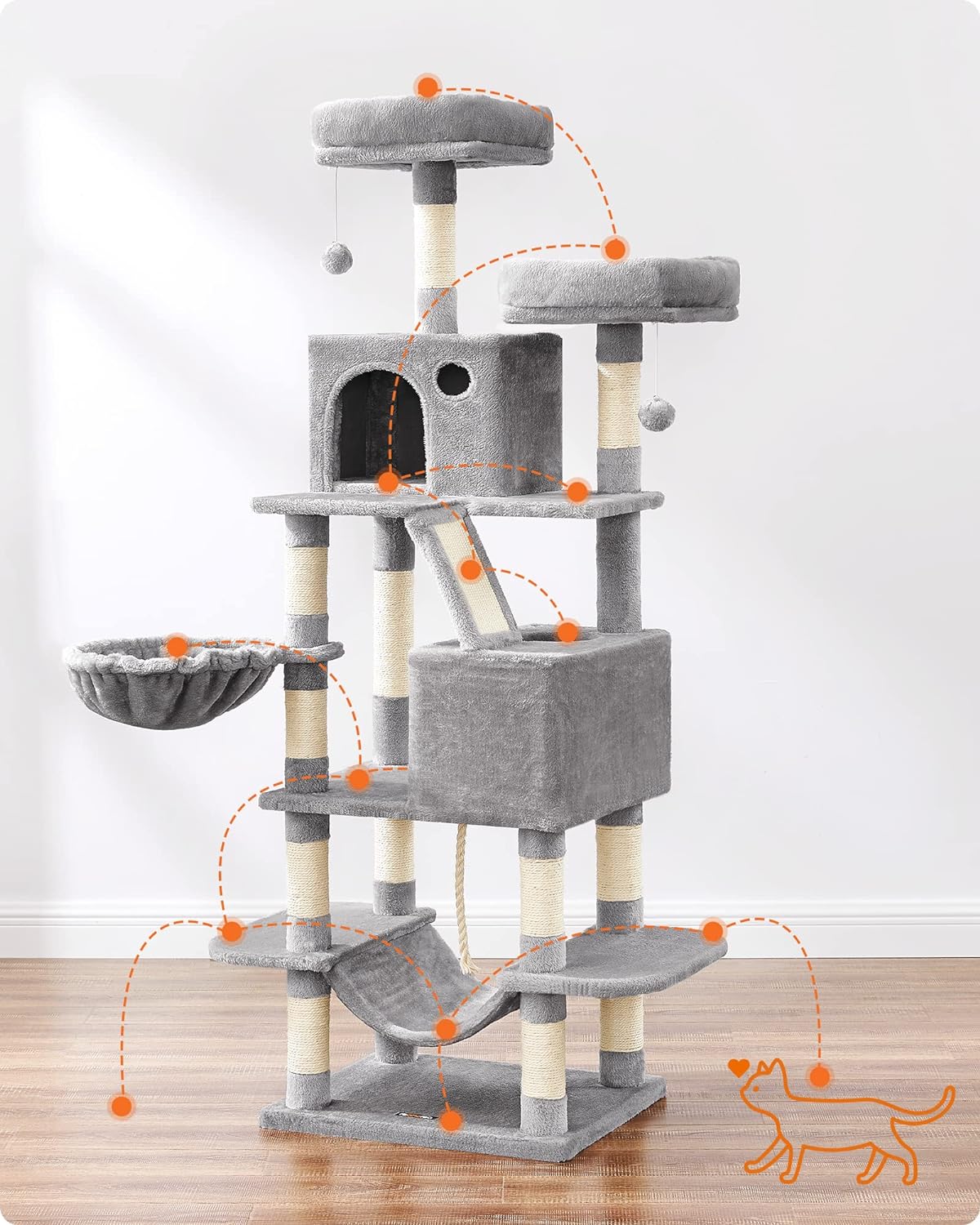 Predstavujeme „Škrabadlo a strom pre mačky“ – dokonalé ihrisko na strome pre mačky, ktoré vašich mačacích priateľov zabaví na celé hodiny! Tento strom pre mačky, ktorý sa týči do výšky 168 cm, ponúka nekonečnú zábavu pri lezení, ktorá uspokojí aj tie najodvážnejšie mačky.