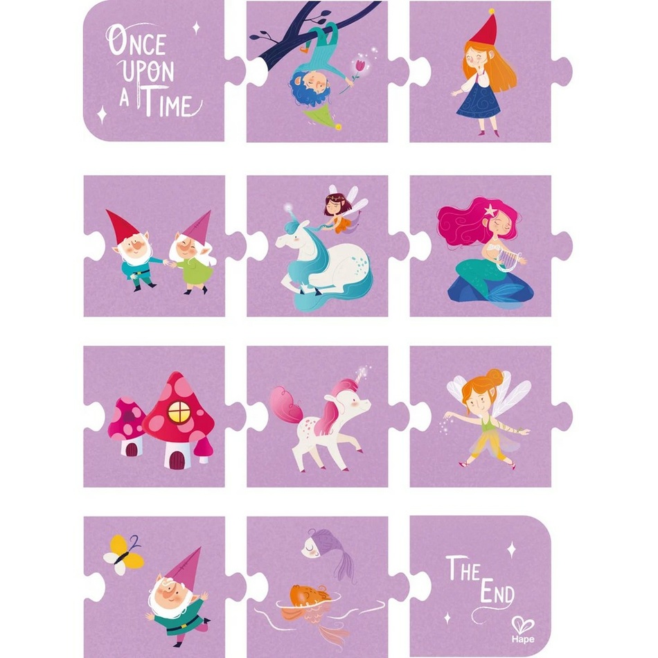 Každá skladačka má iný počet dielikov (9, 12, 16, 20). K dispozícii majú deti plagát s predlohou, ktorá im so skladaním pomôže. Súčasťou sady je aj 12 obrázkov, z ktorých si deti môžu zložiť svoj vlastný rozprávkový príbeh. Ten môže byť zakaždým iný.